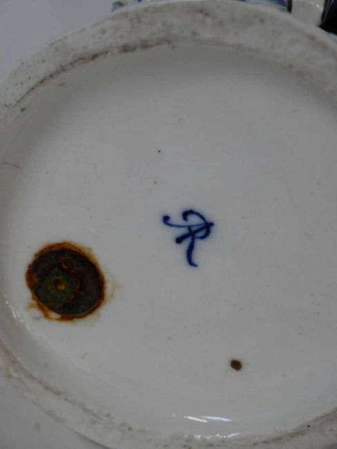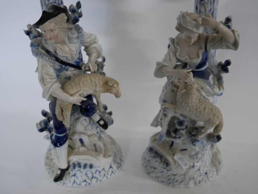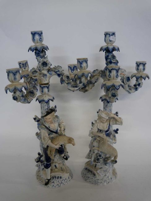 Pair of Dresden four branch candelabra, the stems modelled as a shepherd and shepherdess, decorated in an underglaze blue, 50cm high