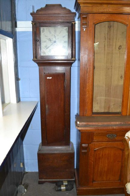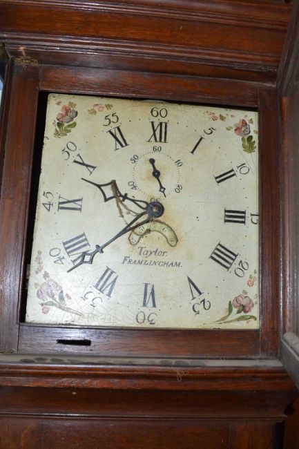 Taylor, Framlingham, a Georgian 30-hour longcase clock with floral painted dial with subsidiary seconds dial and date aperture, fitted with a brass 30-hour movement, striking on a bell, the oak case with moulded pediment, pillared decoration to hood, trunk door and box base