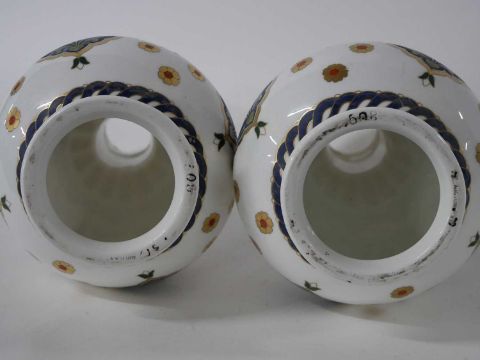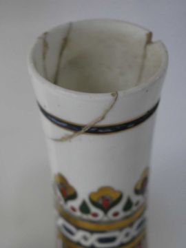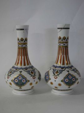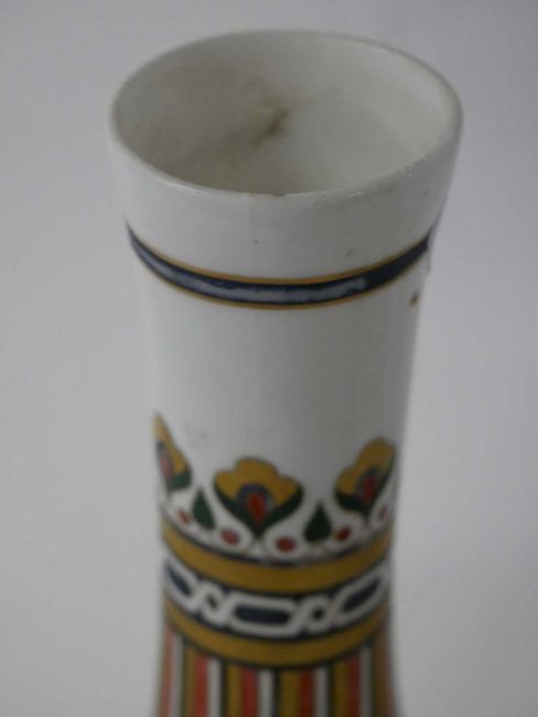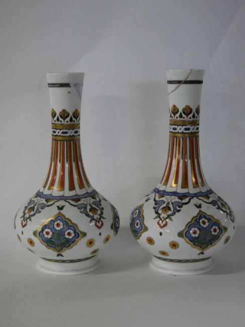 Unusual pair of 19th century Mintons vases with hollow bases and geometric designs, possibly after Christopher Dresser (one vase with damage to neck), 30cm high