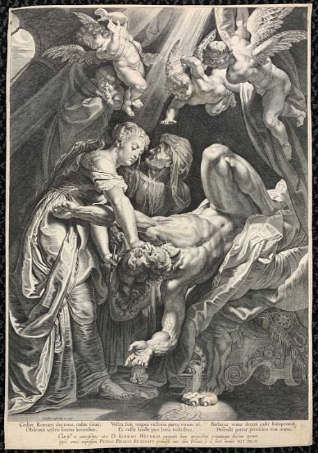 Cornelius Galle (1576-1650) after Peter Paul Rubens, Judith beheading Holofernes; Judith at left, grasps Holofernes' head and cuts his neck with a sword, four putti hover overhead, engraving, circa 1616, 38x55cm, unframed.
