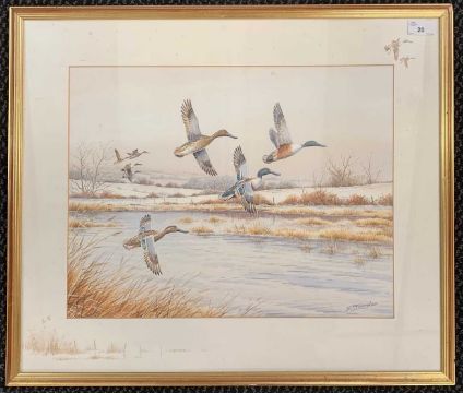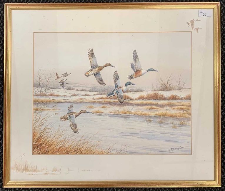Simon Trinder (British, 20th century), Ducks alighting over winter marshland, signed, 36x46cm, framed and glazed.