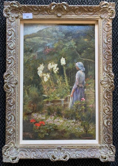 Edith A. Rideout (British, 19th century), 'The Garderner's Daughter', oil on board, signed and dated '93, 30x48cm, framed, (housed loosely).