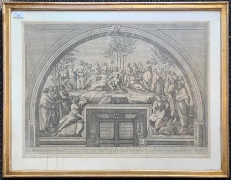 Francesco Faraone Aquila (Italian c.1676-1740), after Raphael, 'Parnassi Montem Spectantibus Summo in Vertice Residens, Oculorum Aciem Statim...', copper plate engraving laid on board, published by Dominici de Rossi, Rome, 71x51.5cm (sheet size) 78.5x60cm (inner frame dimensions), [circa 1722], framed and glazed.