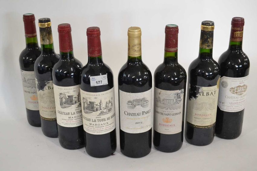 Eight assorted reds: to include two bottles of Chateau de La Tour Margaux 2005, two bottles of Chateau Talbot Bordeaux 2016, two bottles of Chateau Lamothe Saint Germain Bordeaux 2016, one bottle of Chateau de Musset Cuvee Premier Lalande de Pomerol 2010, and one bottle Chateau Paret 2015, (8)