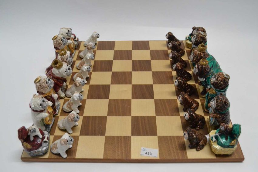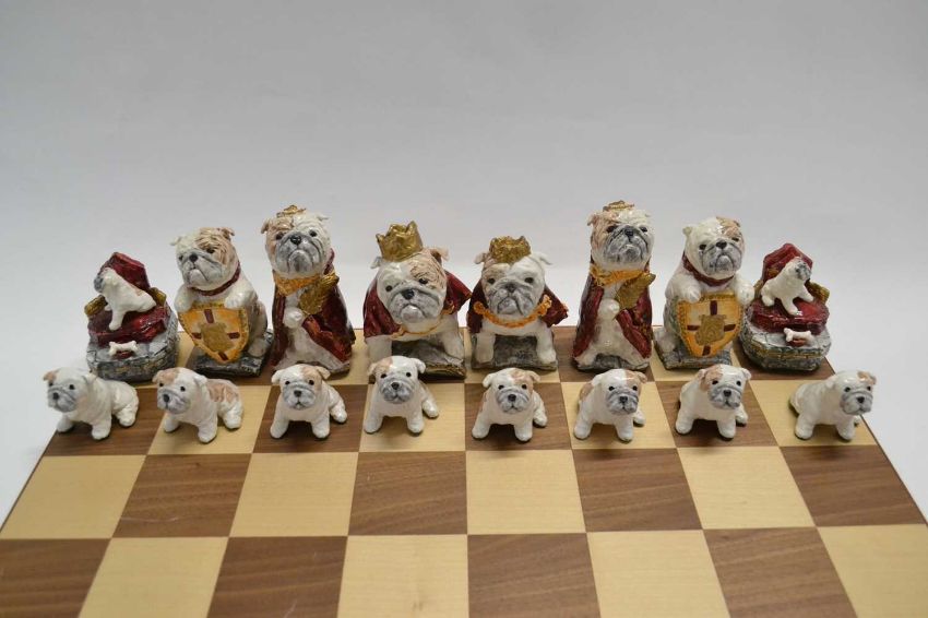 A Sylvia Smith chess set, with handpainted brown and white bulldogs, each figure signed, with later chess board