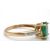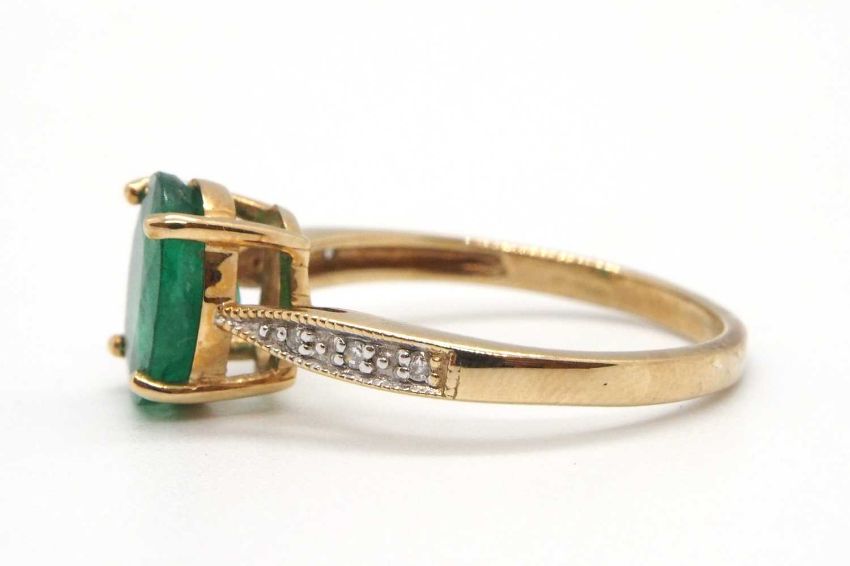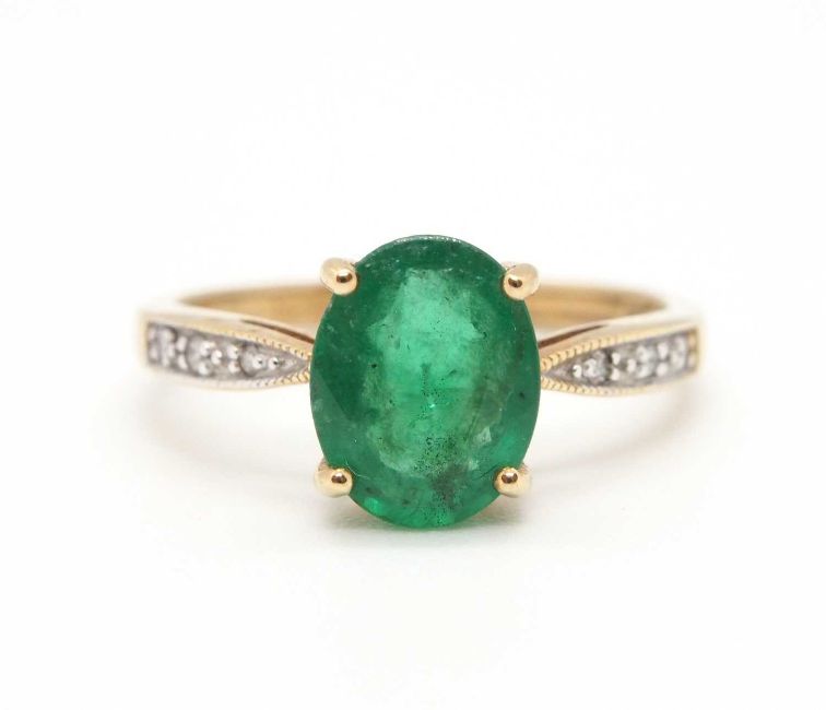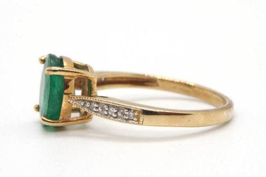 A 9ct emerald ring, the oval emerald, approx. 9mm long, in a four claw mount, with diamond highlights to shoulders and plain band stamped 375 with Birmingham assay mark, size N, 2.3g