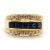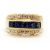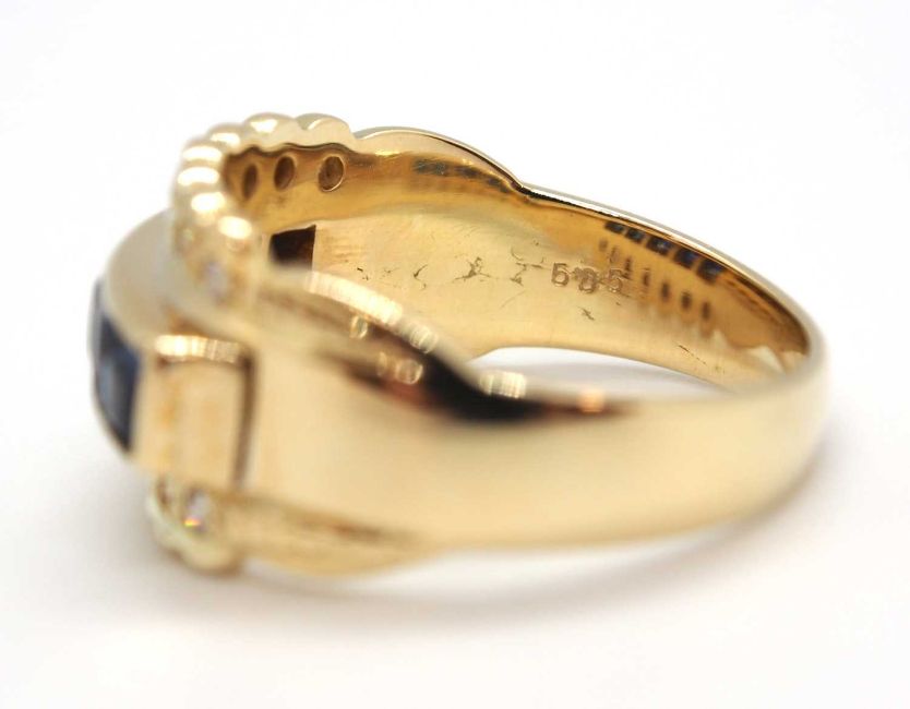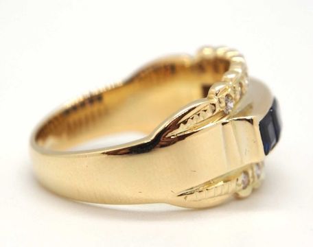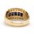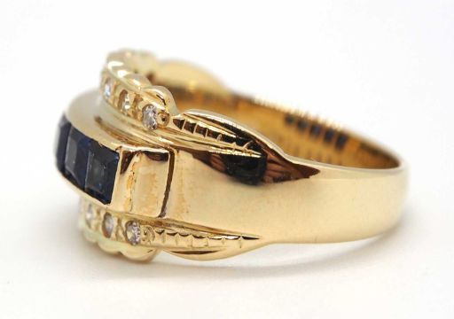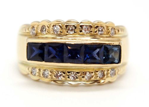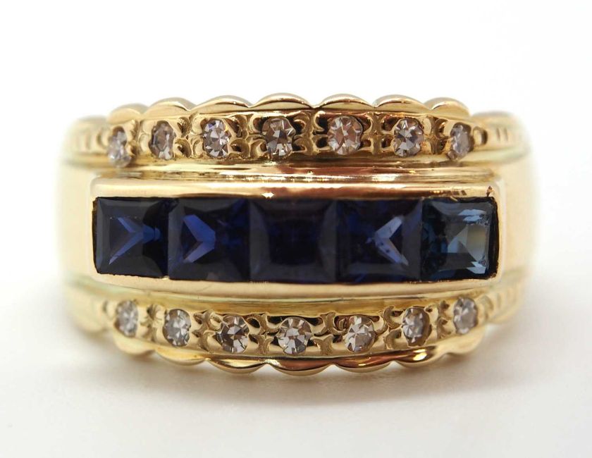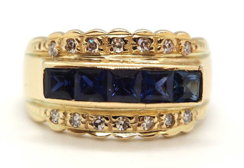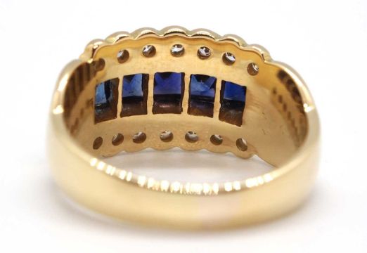 A sapphire and diamond ring, the 10.5mm band set with a central row of claibre cut sapphires with a row of small round brilliant cut diamonds above and below, with tapered band stamped 585, size L, 5.6g