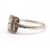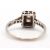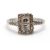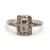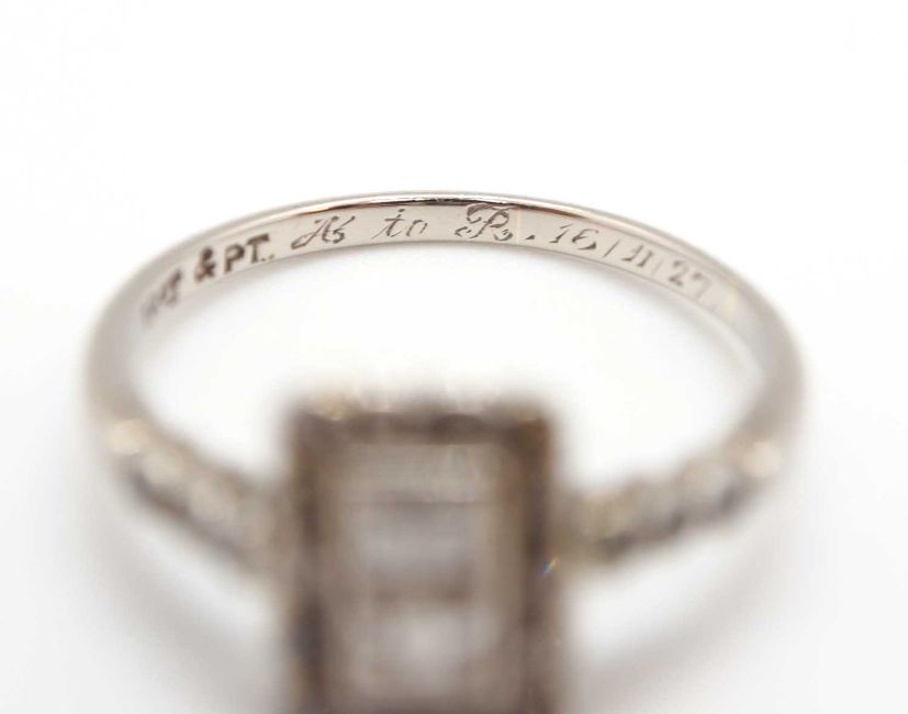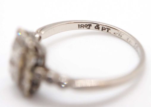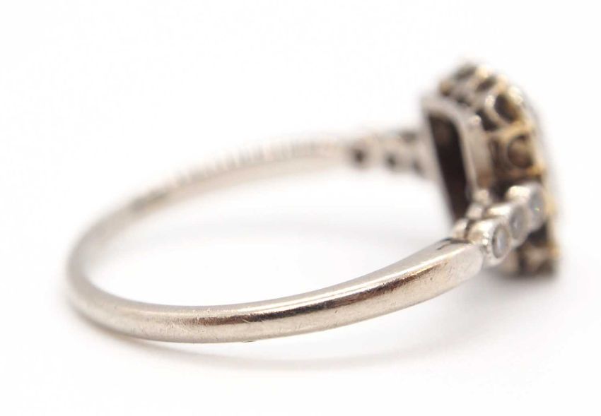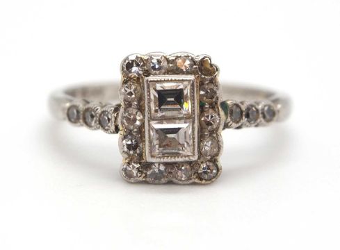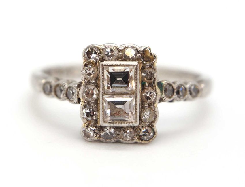 An Art Deco 18ct and platinum diamond ring, set to centre with two square step cut diamonds and surrounded by single cut diamonds, head approx. 8.5mm long, with three single cut diamonds to each shoulder, all with millegrain mounts and plain band stamped 18ct Plat, size J, 1.8g