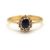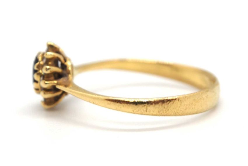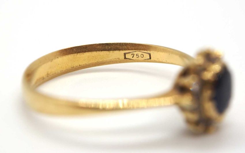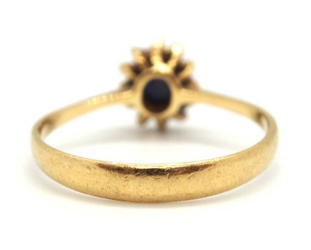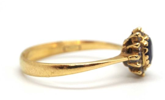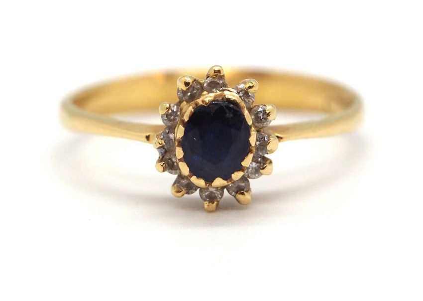 A sapphire and diamond cluster ring, the central oval sapphire surrounded by small round diamonds, head 8.5mm long, all set in yellow gold with plain band stamped 750, size P, 2.5g