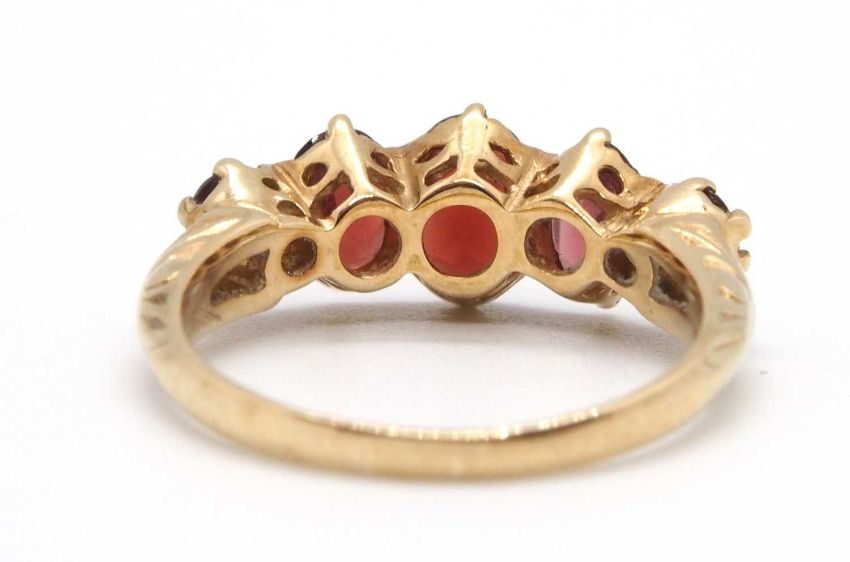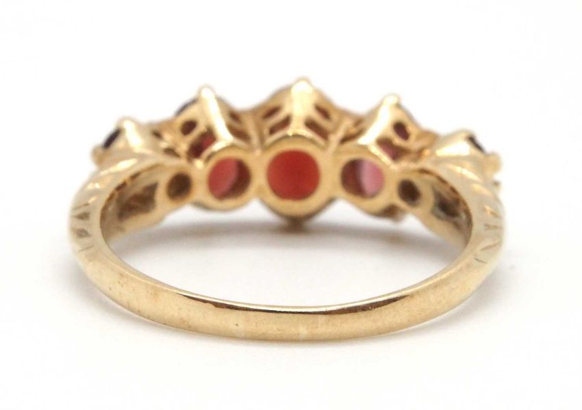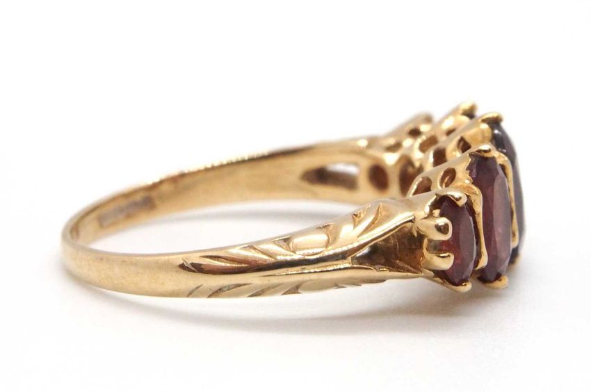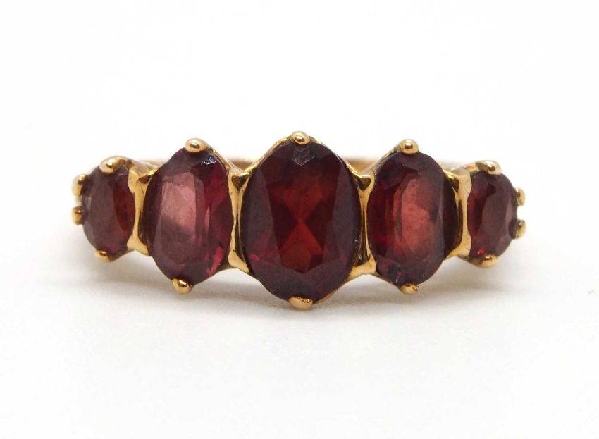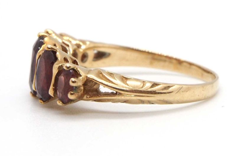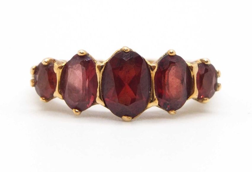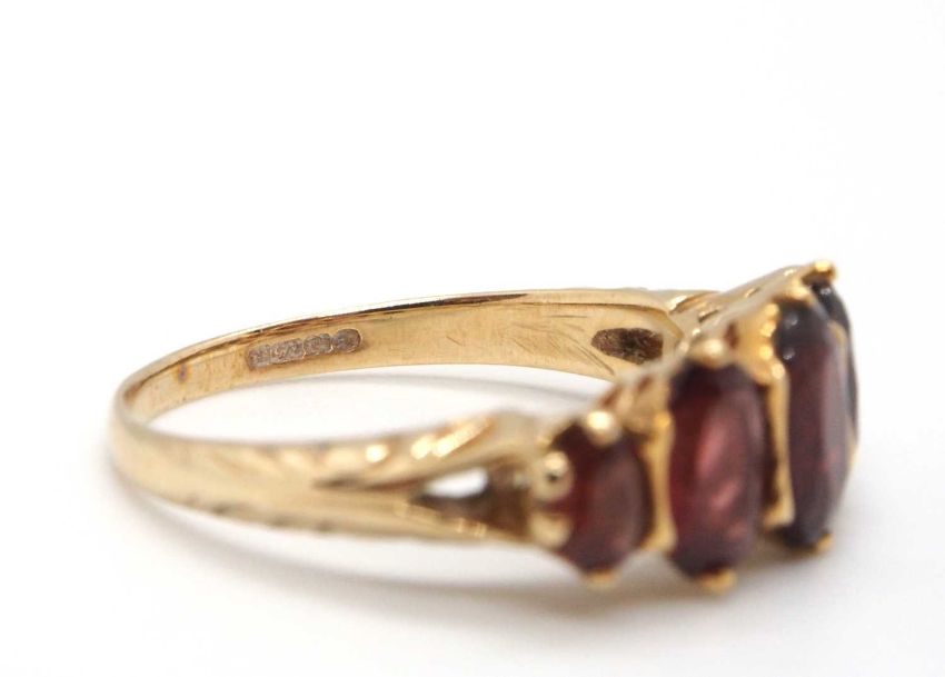 A 9ct garnet ring, the five oval graduated garnets, claw mounted with tapered shoulders and plain band stamped 375 (other marks obscured), size M-N, 3.0g