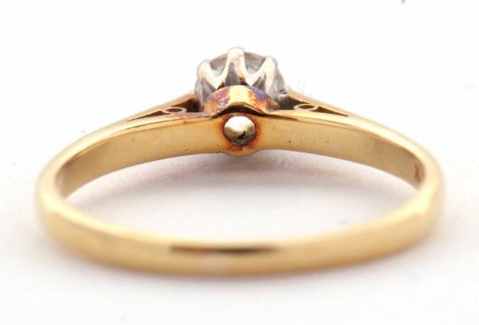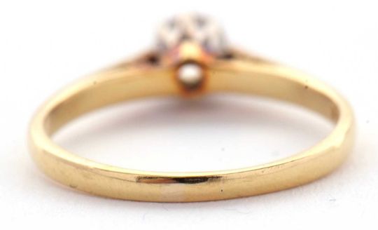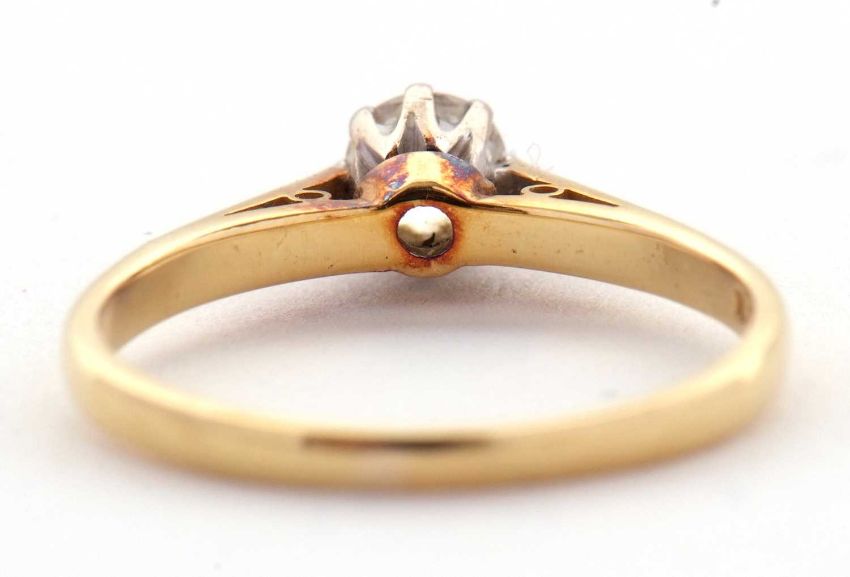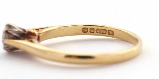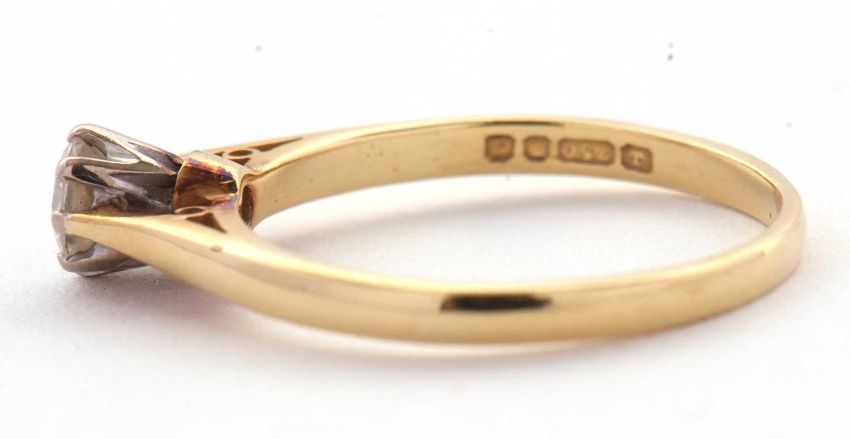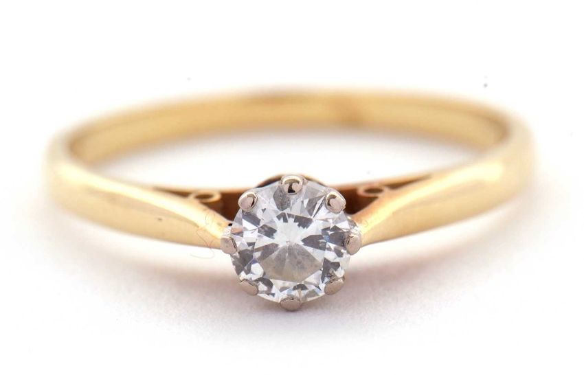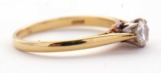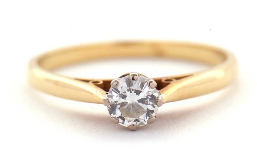 An 18ct solitaire ring, the round brilliant cut diamond, estimated approx. 0.33cts, with plain band hallmarked London 1988, size L-M, 2.1g