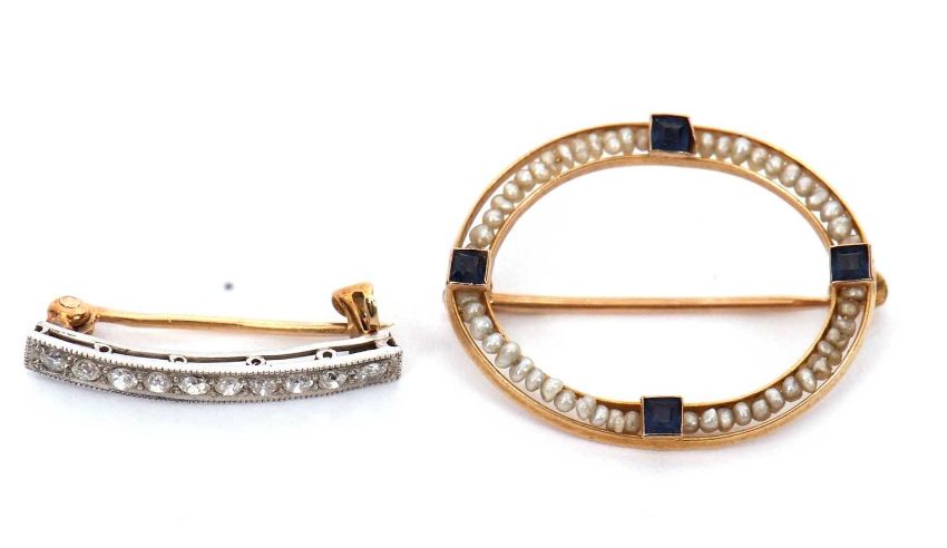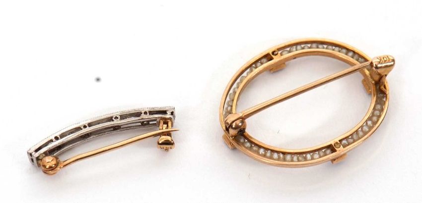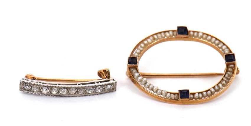 A diamond brooch and a seed pearl brooch: the slightly curved diamond brooch set in white and yellow metal, stamped 14K, 2cm long, 1.2g; together with an oval seed pearl and blue stone brooch, stamped 10K, 23mm long, 1.4g, (2)