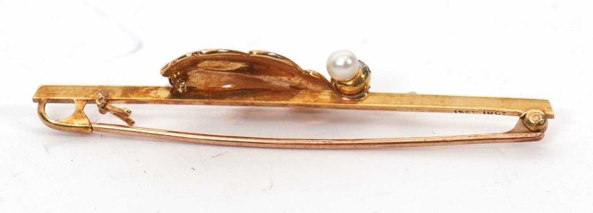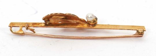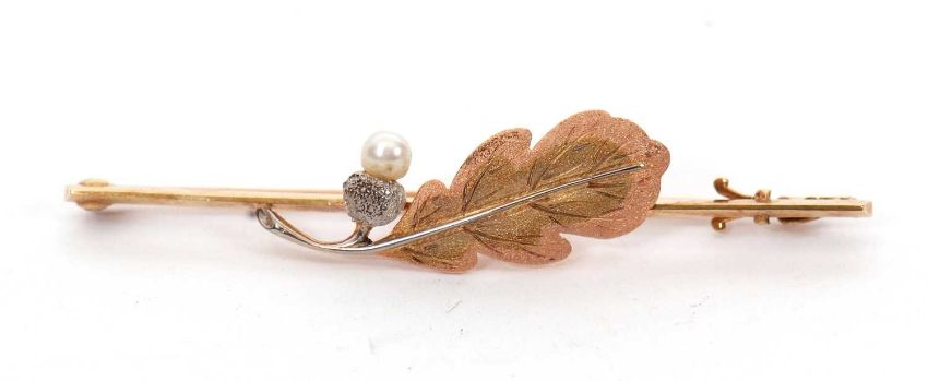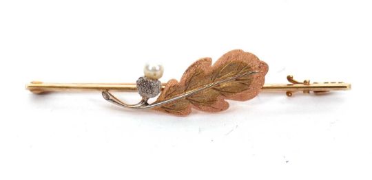 A 15ct and 18ct cultured pearl oak leaf brooch, set with a bi-colour gold oak leaf with a cultured pearl acorn, the whole set to a plain blade stamped '15ct 18ct', 58mm long, 4.6g