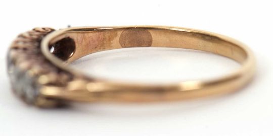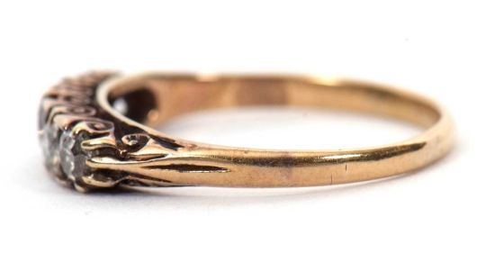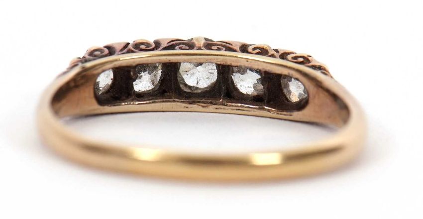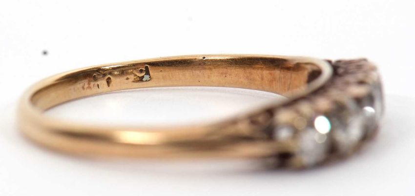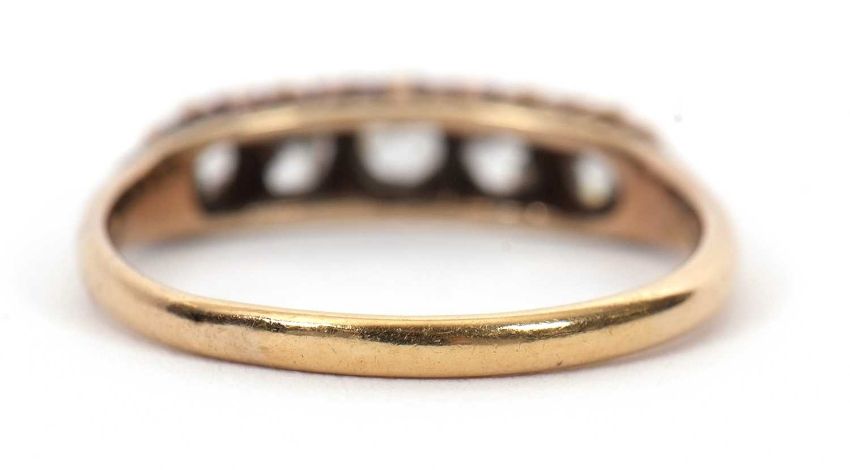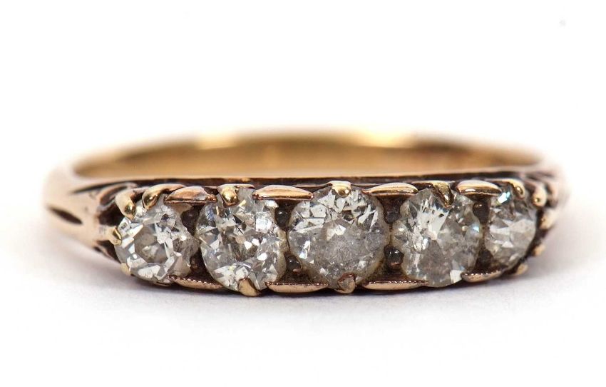 A five stone diamond ring, the five graudated old mine cut diamonds, total estimated approx. 1.06cts, claw mounted with plain band (marks worn, tests as approx. 18ct gold), size U, 3.6g