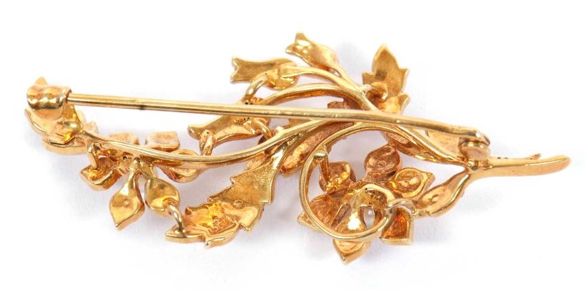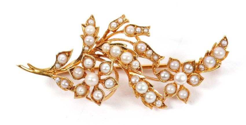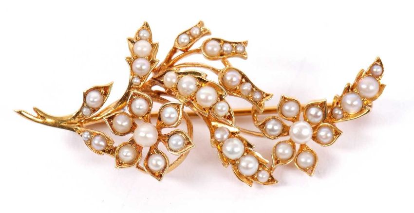 A late Victorian 15ct seed pearl spray brooch, set throughout with seed pearls of varying sizes, stamped 15ct to reverse, 5cm long, 7.8g