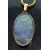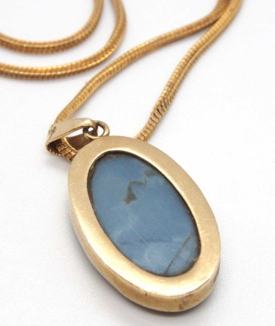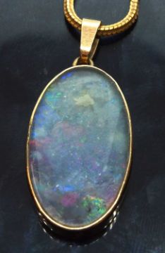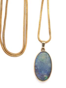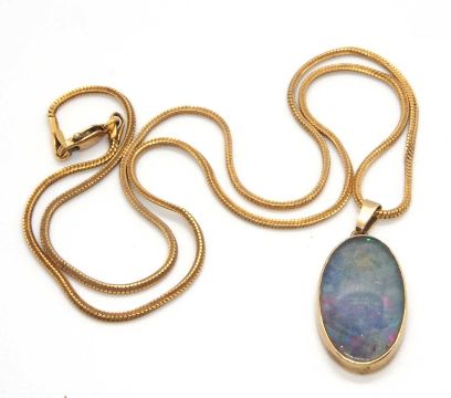 An opal pendant and chain, the oval opal in collet mount with open back, 25mm long, with tapered bale stamped 9ct, on chain with lobster clasp stamped 375, 14.4g gross