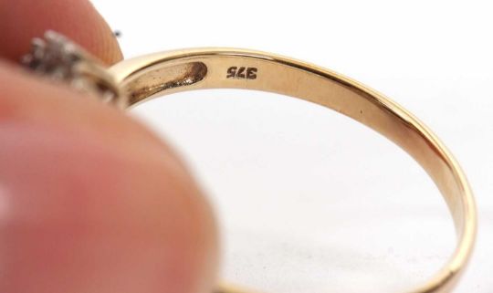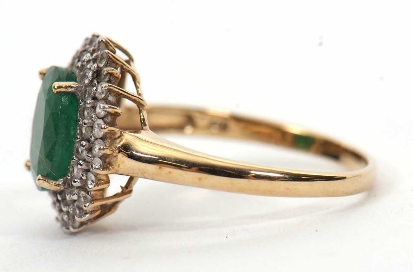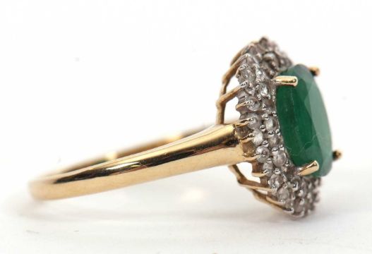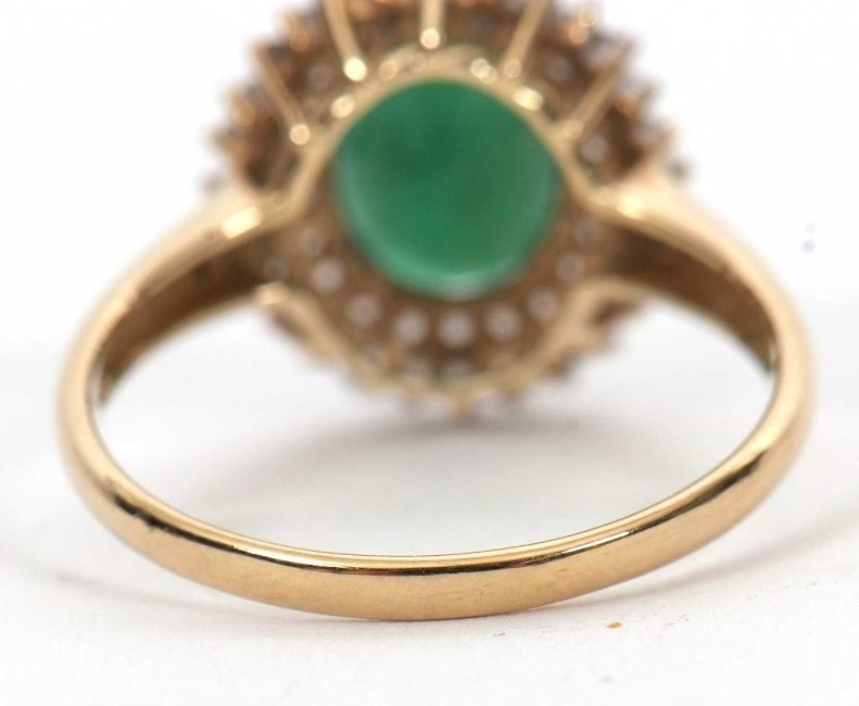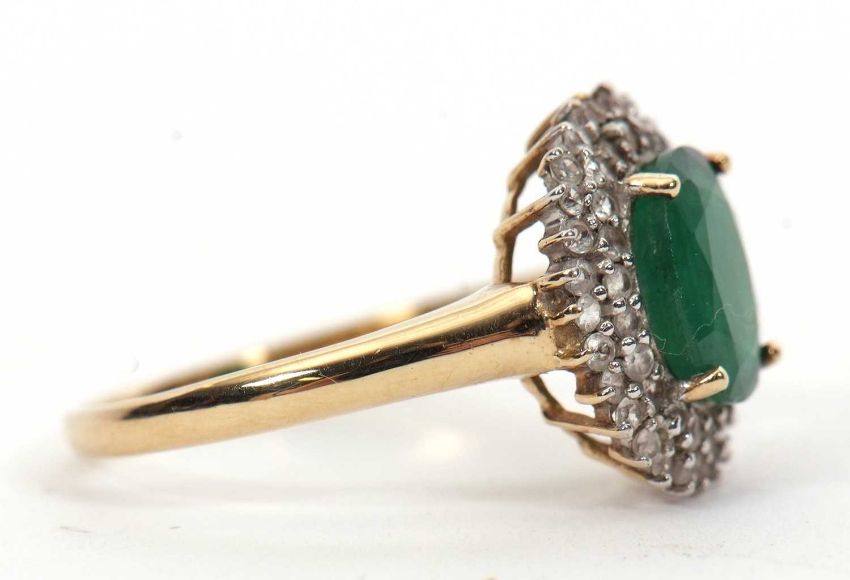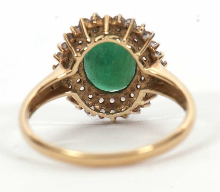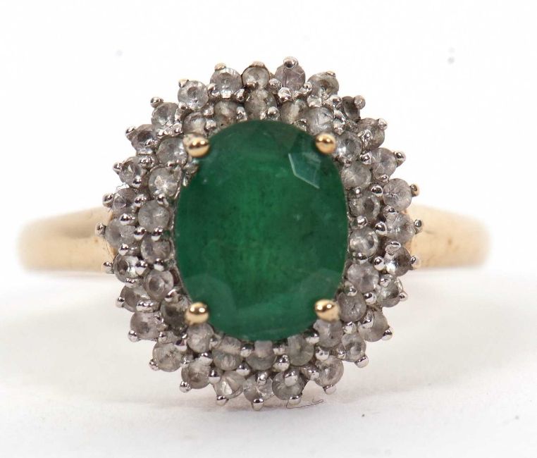 A 9ct emerald and diamond cluster ring, the oval emerald, approx. 9mm long, surrounded by two rows of small round diamonds, total estimated approx. 0.50cts, all claw mounted with a plain band stamped 375 with Birmingham assay mark, size O, 2.6g