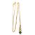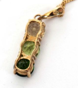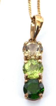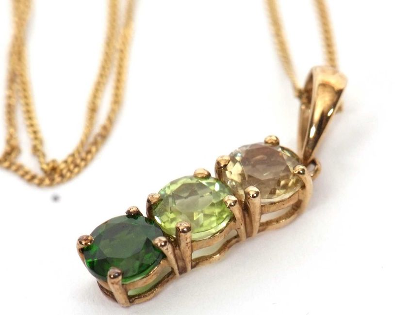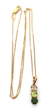 A 9k three green stone pendant and chain, the pendant set with three round faceted green hardstones with tapered bale stamped 9K, 22mm long, on fine chain with tag and clasp stamped 375, 44cm long, 2.0g gross, cased