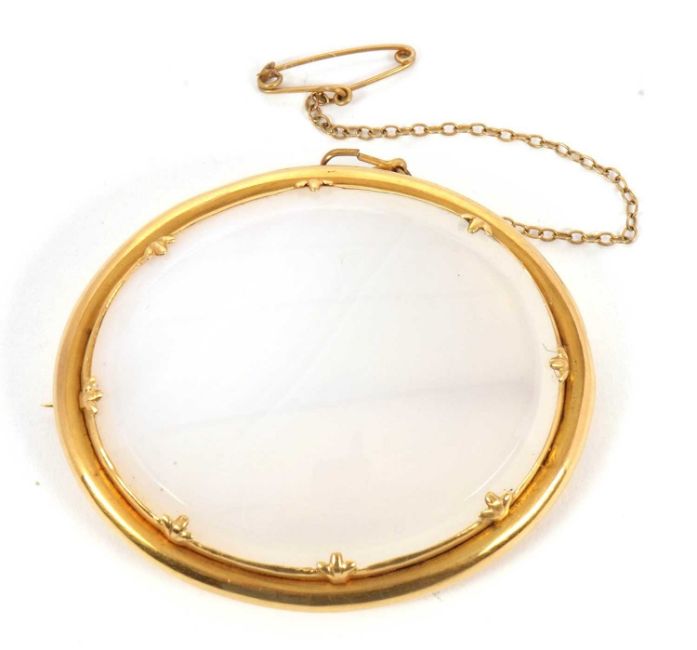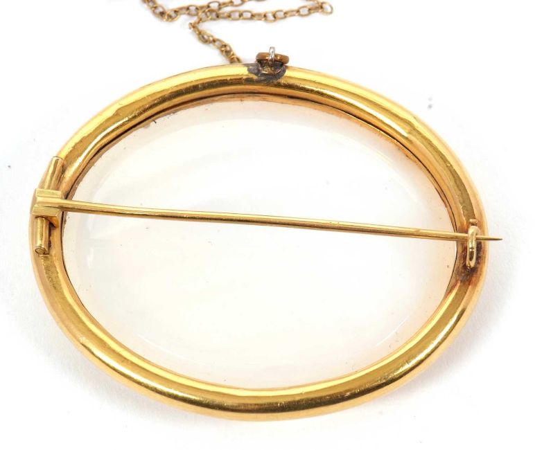 An agate brooch, the oval pale white agate specimen in an unmarked yellow metal mount, (tests as approx. 18ct gold), 5.5mm x 4.5mm, 35.1g