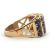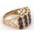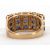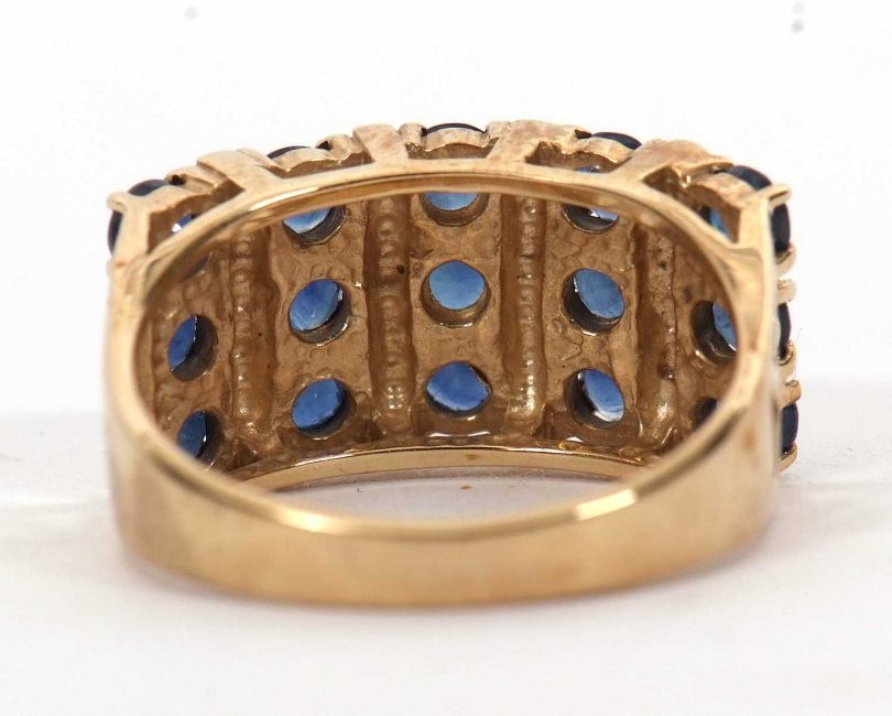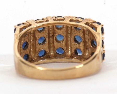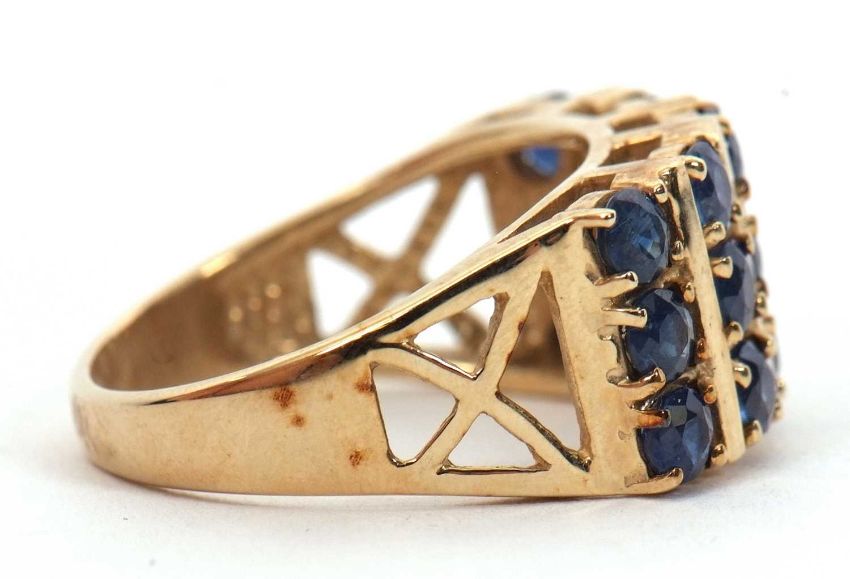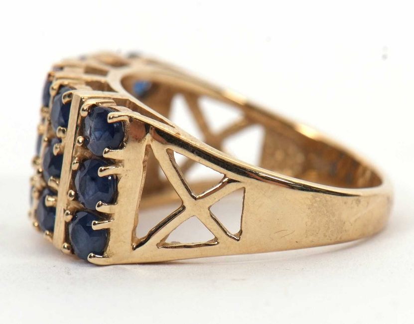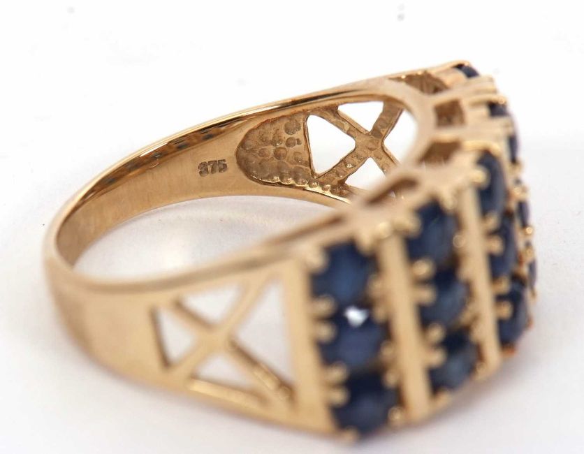 A 9ct stone blue gemset ring, the three rows of round faceted gemstones (possibly kyanite), with open shoulders with cross design and tapered band stamped 375 with Birmingham assay mark, size O, 6.0g