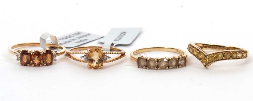 Four 9ct gemset rings: to include a 9ct five stone citirine ring with plain band hallmarked Birmingham 2019, size R, 1.9; a 9ct yellow zircon wishbone ring with plain band hallmarked Birmingham 2019, size R, 2.4g; a 9ct citrine and white stone ring with split textured shoulders and plain band hallmarked Birmingham 2017, size R, 2.4g; and a 9ct three brown stone and white stone highlight ring with plain band hallmarked Birmingham 2019, size R-S, 2.1g, (4)