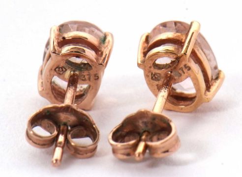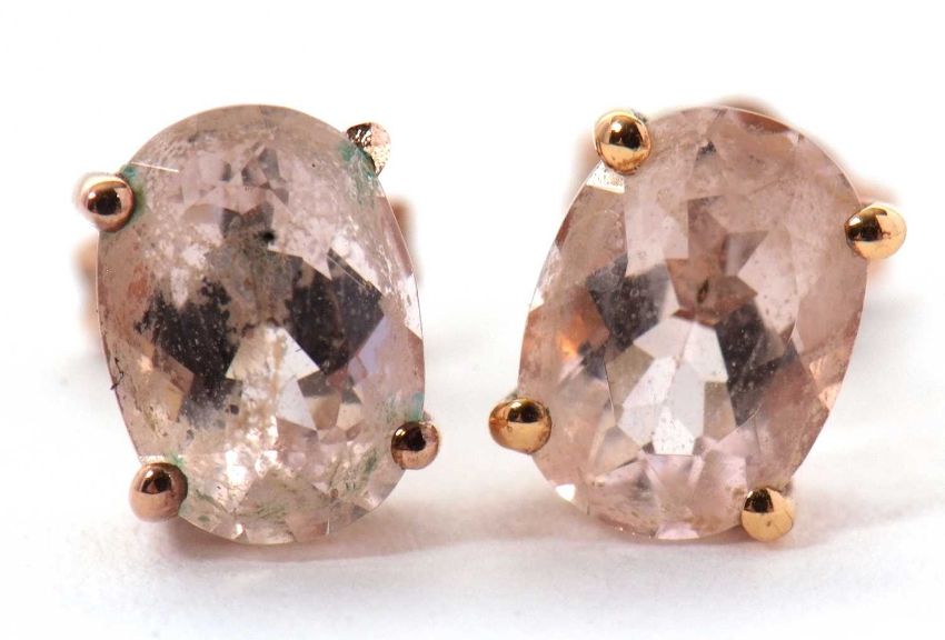 A pair of 9ct morganite earstuds, the oval studs in a four claw mount, 5mm wide, with backs stamped 375, 1.2g