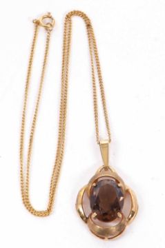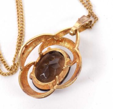 A smokey quartz pendant, the oval smokey quartz set within an openwork scalloped frame with tapered bale, all set in yellow metal with bale stamped 333 (possibly plated), 38mm long, with yellow metal chain with clasp stamped 9ct, 7.2g gross