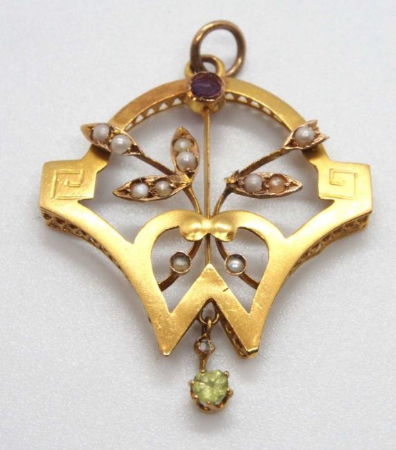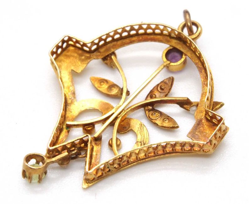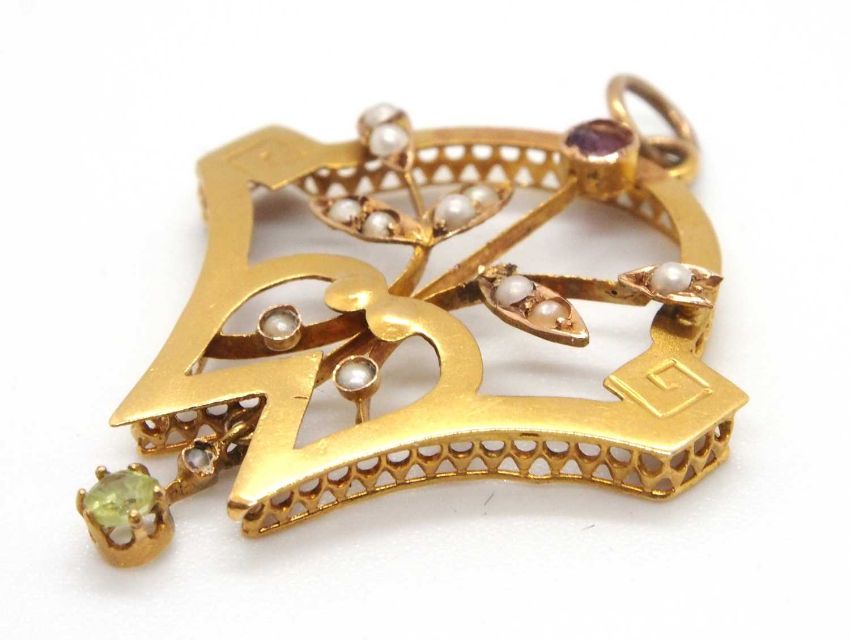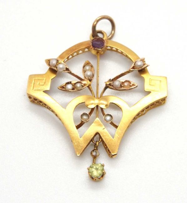 An Edwardian pendant, set with a peridot, amethyst and seed pearls, all set in unmarked yellow metal (tests as approx. 18ct gold), 3cm long, 1.8g