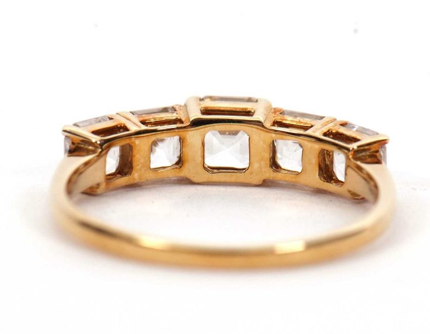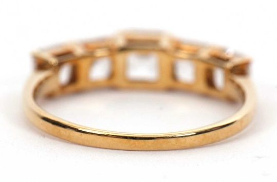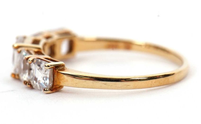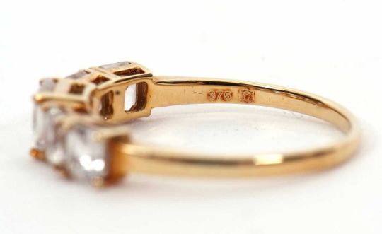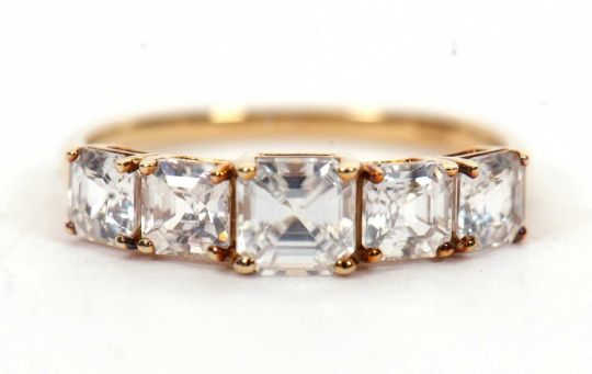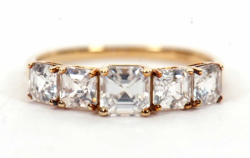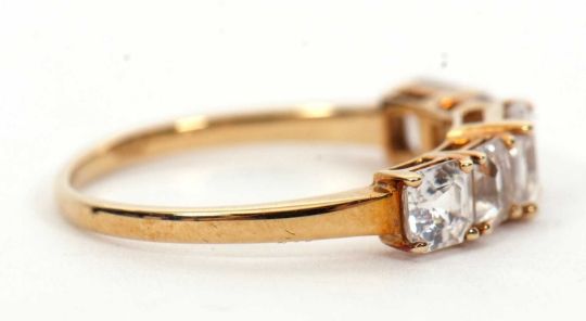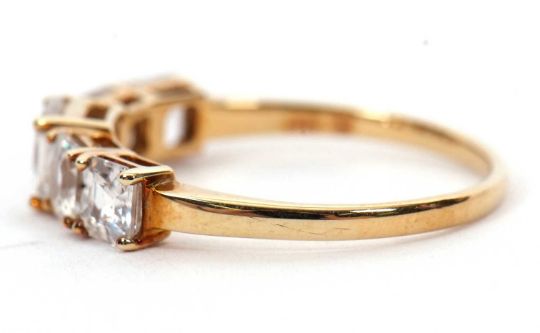 A 9ct white zircon ring, the five graduated square step cut white zircons, all claw mounted to a plain band hallmarked Birmingham 2020, size P, 2.1g, cased