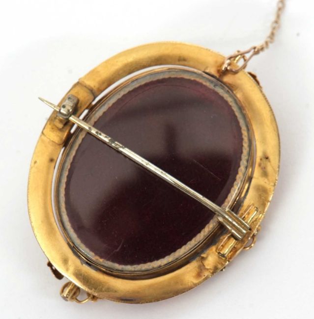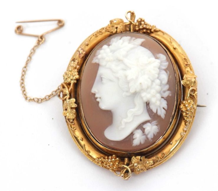 A cameo brooch, the oval shell cameo of a classical maiden with vines in her hair, in yellow metal frame with vine and grape decoration, with glazed keepsake panel to reverse, unmarked (tests as approx. 18ct gold), 52mm long, 19.6g