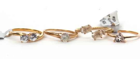 Four gemset rings: to include a 9ct single stone white zircon ring with plain band hallmarked Birmingham 2019, size R, 1.8g, a two stone white zircon ring with crossover band hallmarked Birmingham 2019, size R, 2.0g; a 9ct two stone citrine ring with ridged crossover band hallmarked Birmingham 2019, adjustable size, 2.1g; and a 9ct white stone trillion cut ring with plain band hallmarked Birmingham 2018, size R, 1.5g, (4)