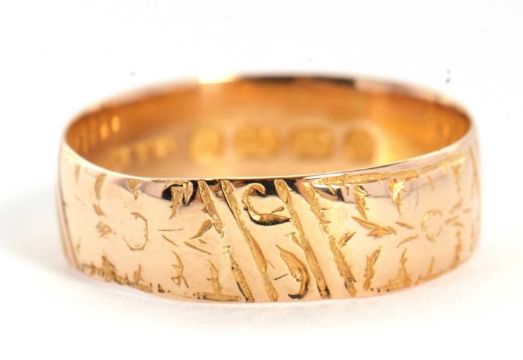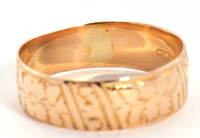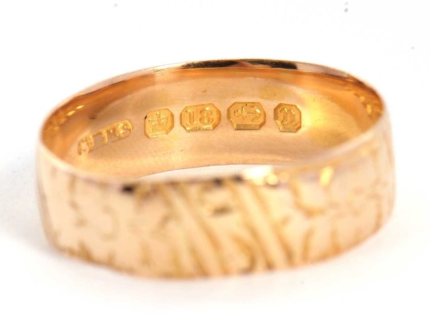 A late Victorian 18ct gold ring, with chased floral decoration, 6mm wide, hallmarked Birmingham 1887, size P, 3.0g, cased