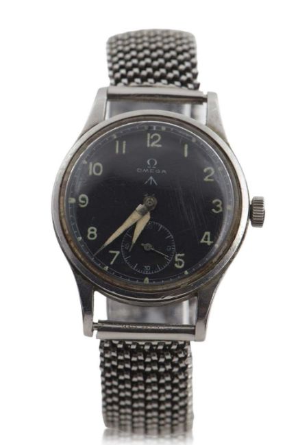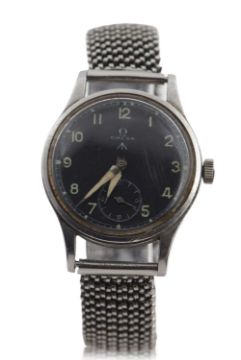 A military Omega Dirty Dozen gents wristwatch, the watch has a stainless steel case and a manually crown wound 15 jewel movement, black dial with luminous hour markers and the movement number is 10263382, the case back is engraved "W.W.W." followed by the military arrowhead and then "Y9165 and 10673364", the hands have been re-finished along with the hour markers, it has a 35mm case size and is circa 1944