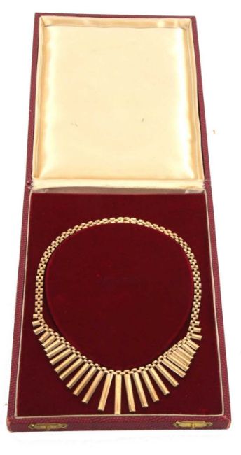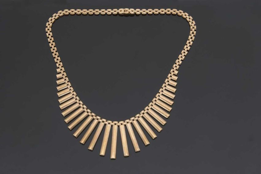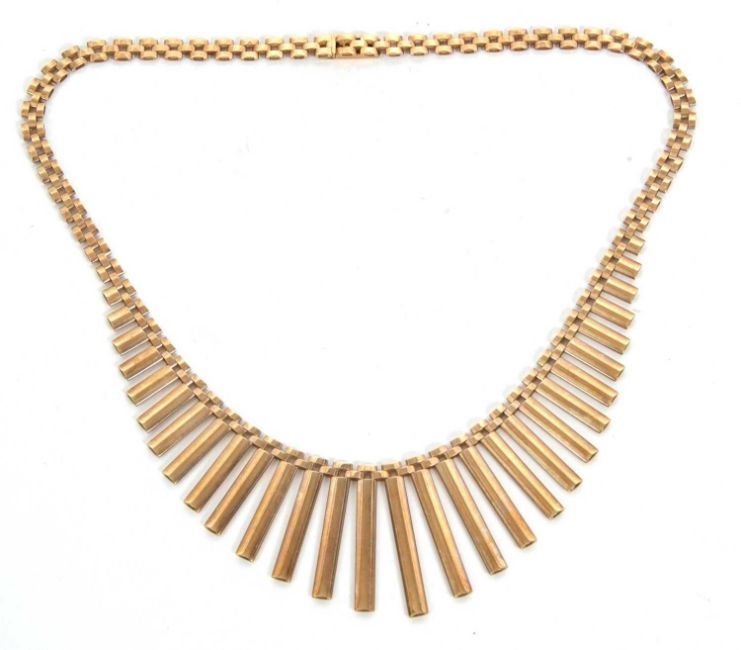 A 9ct fringe necklace, the graduated fringe of rectangular links tapering to an integrated clasp hallmarked London 1964, 40cm long, 26.9g, cased