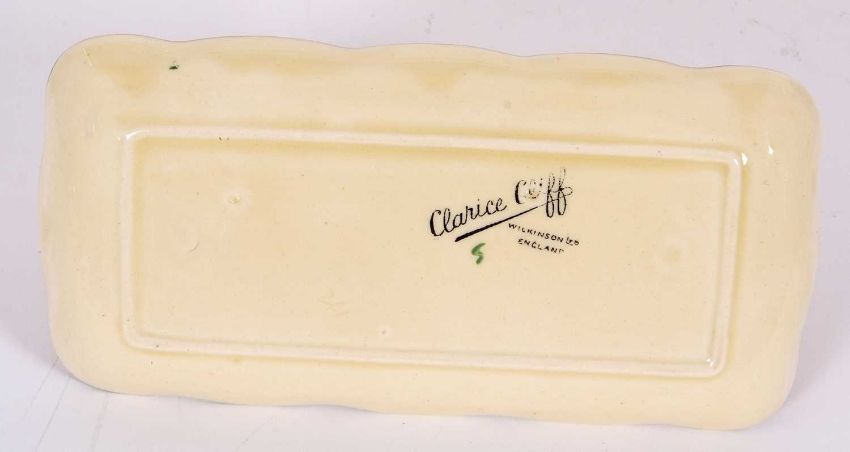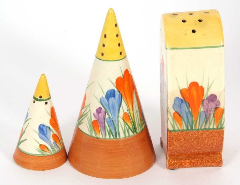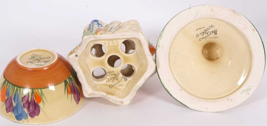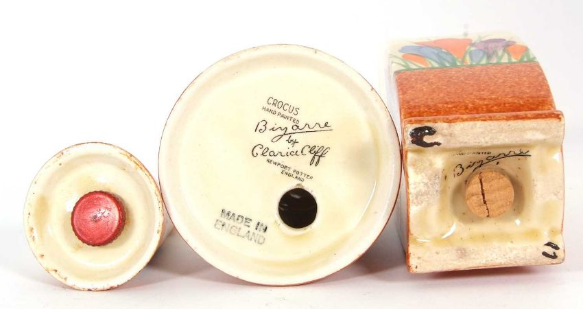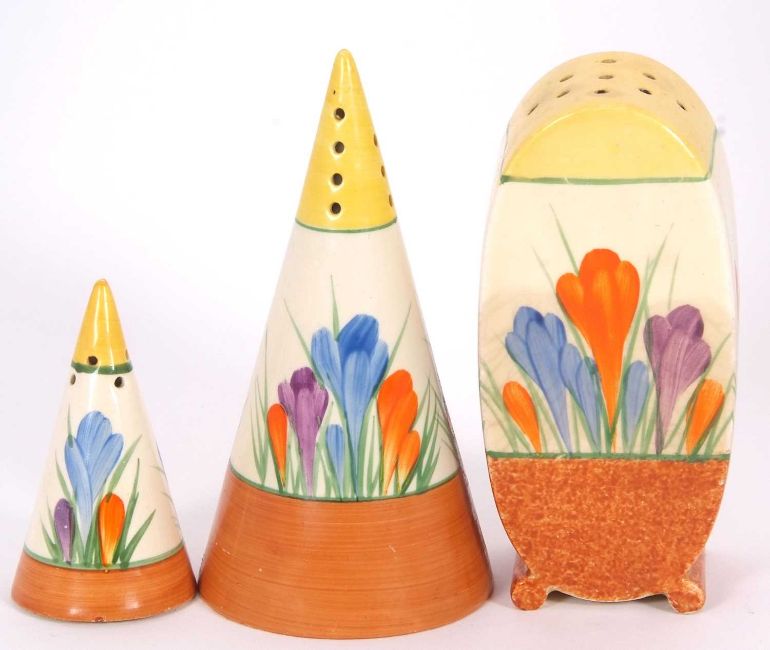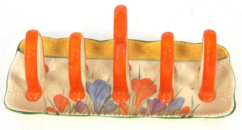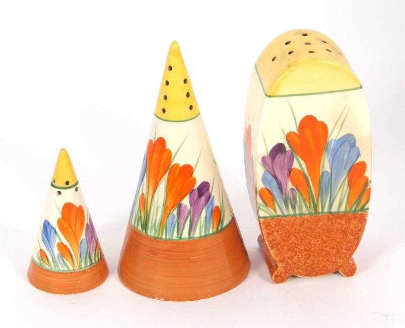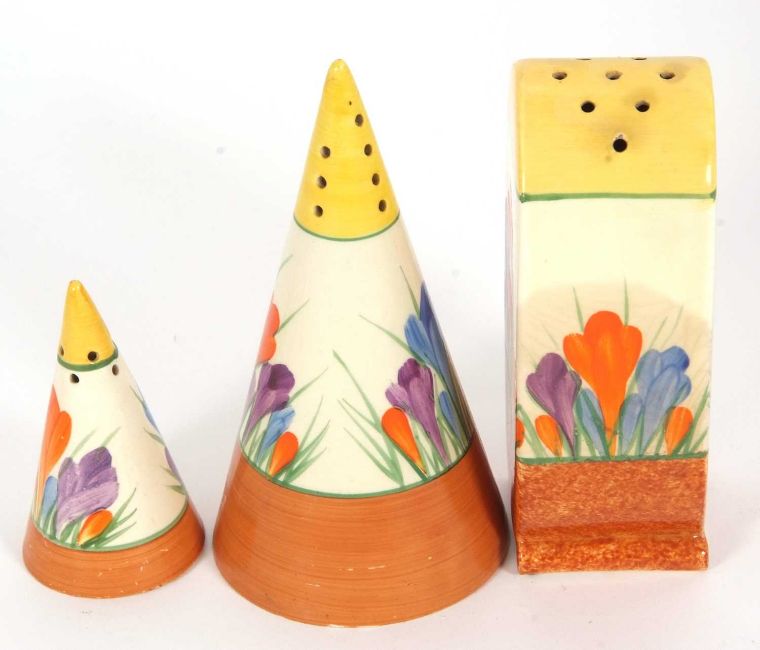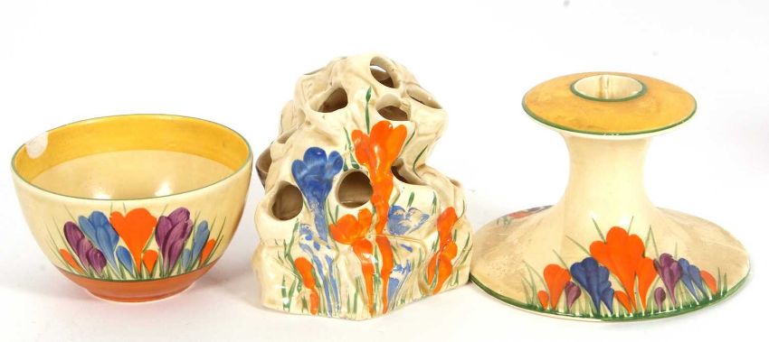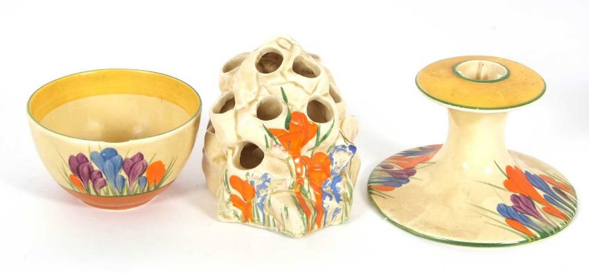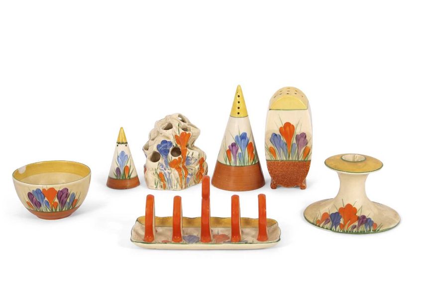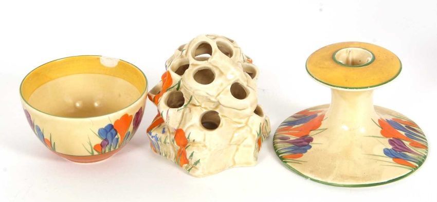 A group of Clarice Cliff crocus wares including a Bonjour shaped sifter together with a further conical shaped sifter, a small bowl (chip to rim), toast rack, flower head, smaller conical sifter and a candlestick (7), largest 14cm high