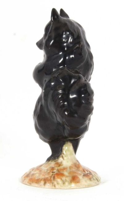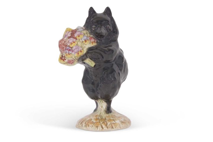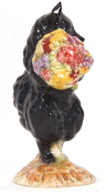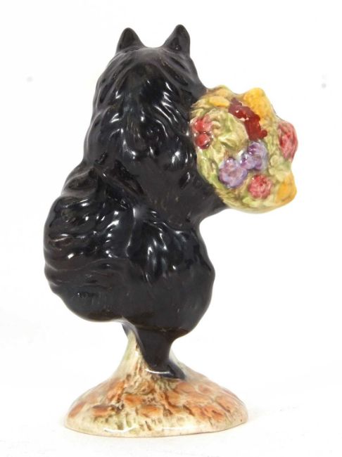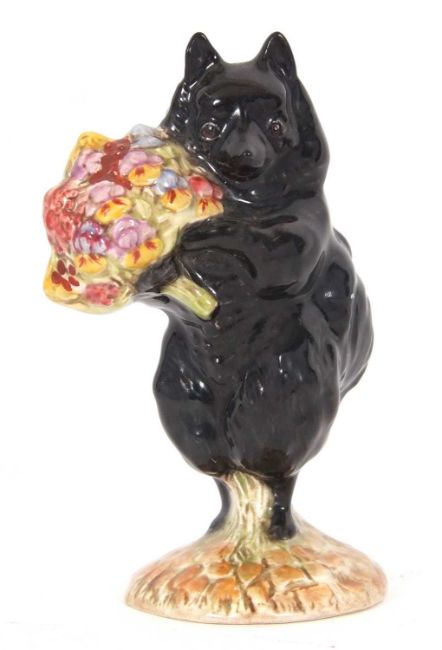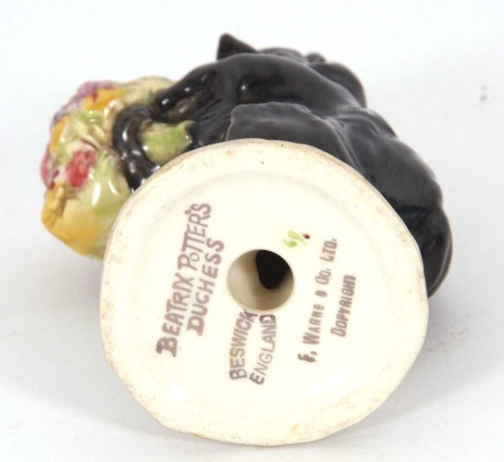 Beswick. Duchess with Flowers, from Beatrix Potter, very rare figurine, depicting a black dog holding a bunch of flowers, gold oval on underside of base (BP-2), modelled by Graham Orwell and issued between 1955-1967.