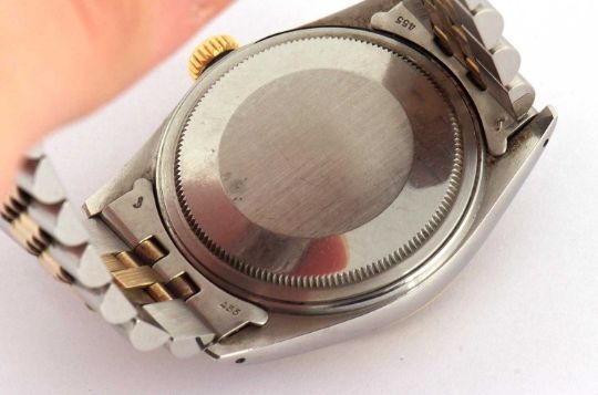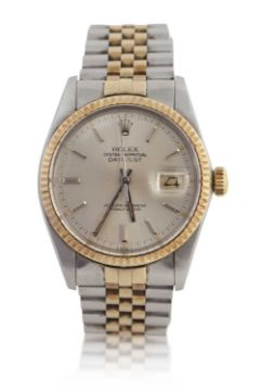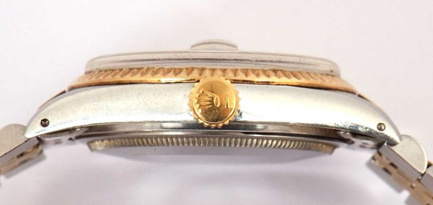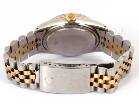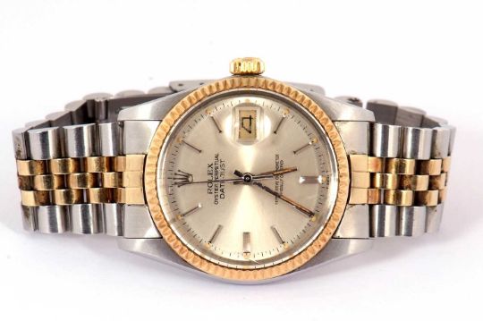 A Rolex Datejust 36 Ref: 16013, it has a two tone Jubilee bracelet and a silvered coloured dial with baton hour markers and date aperture, it has an automatic movement, Rolex screw down crown and the bracelet number is 62523-H14 with 455 end links, the watch is circa 1982