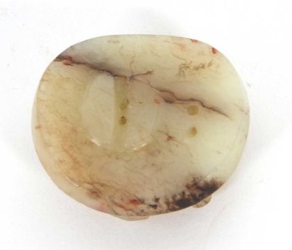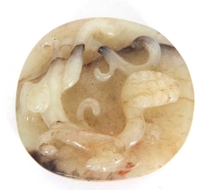 A jade pendant with dragon carving with brown occlusions, 4cm diameter