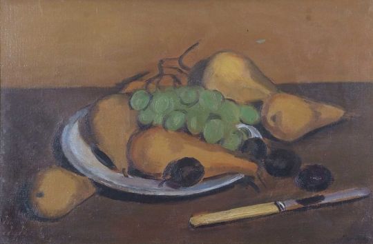 Bernard Meninsky (1891-1950), "Still Life-Pears", oil on canvas, signed, The Boydell Galleries label on verso of frame together with an inscription in ink which reads "Purchased at Sotheby's "Salix" sale 11/11/1981 lot 322", 38.5x59cm, framed