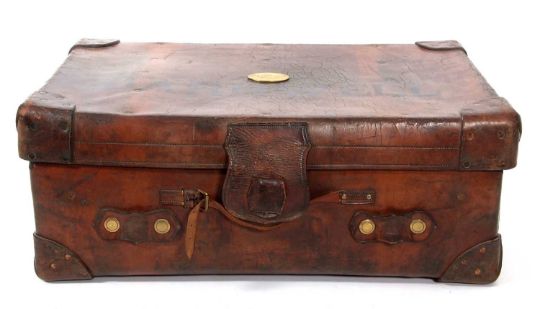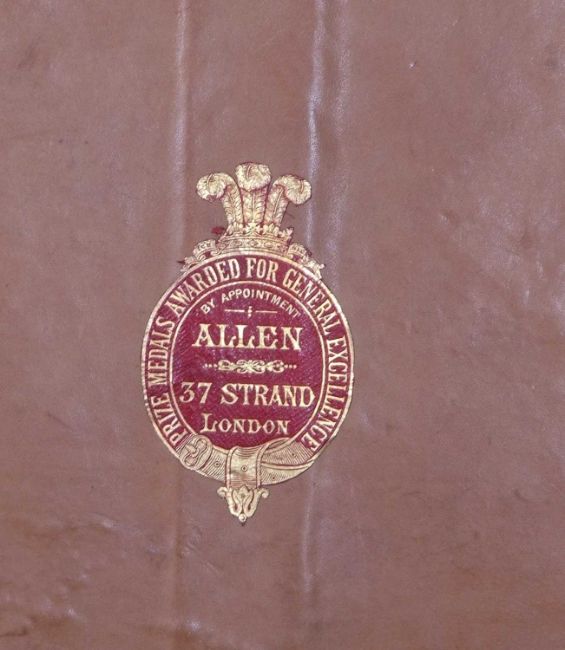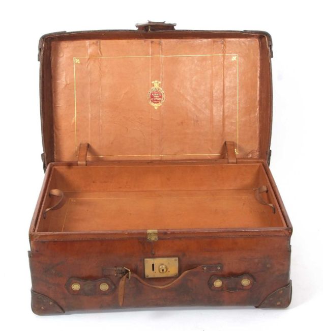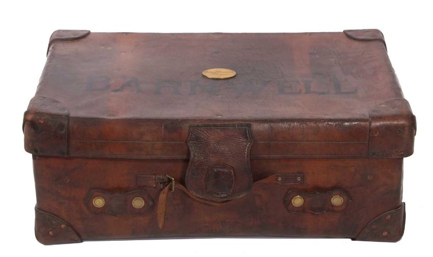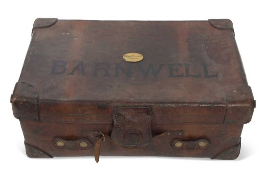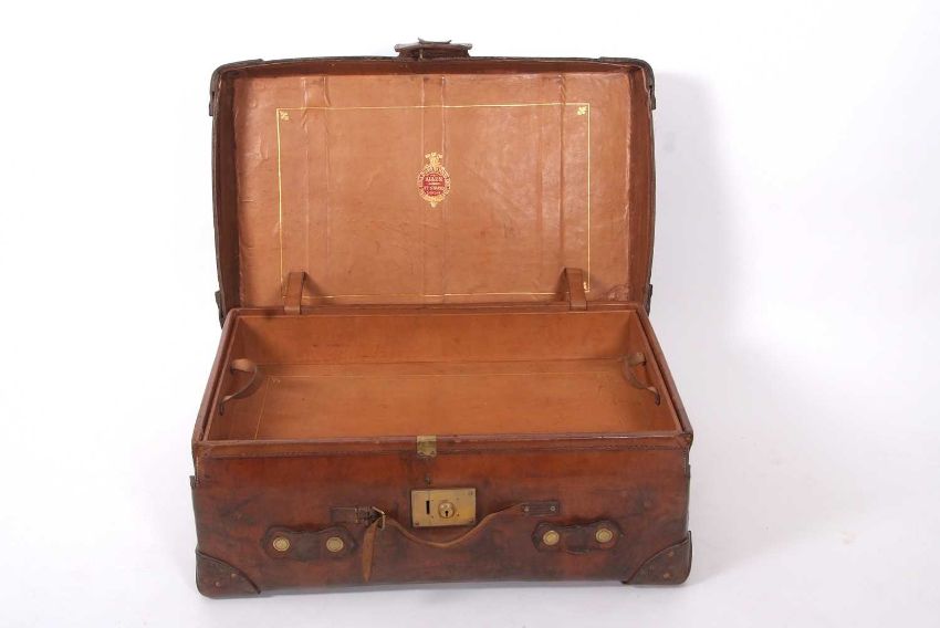 Allen, 37 Strand, London a large brown leather suitcase of hinged rectangular form, the interior with pull out tray, the lid with brass cartouche plaque marked Richard Barnwell, Glasgow, 84cm wide