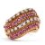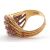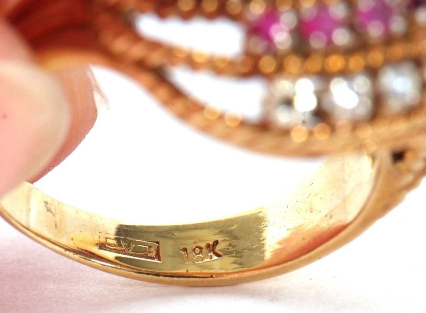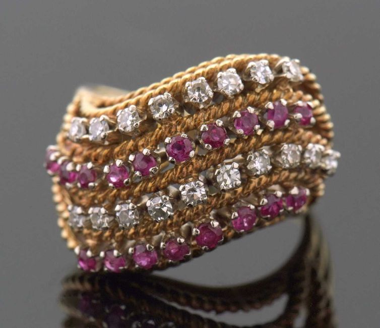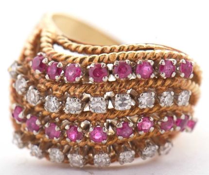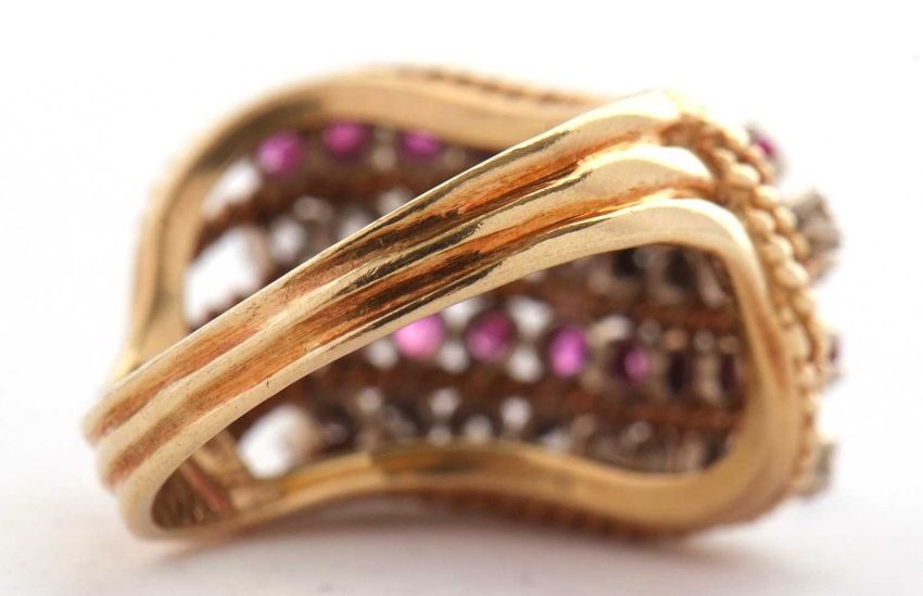 An 18ct diamond and ruby ring, set with four alternating curving diagonal rows of rubies and diamonds, separated by textured strands tapering to a plain lower band, stamped 750 with London import mark 1964, size M, 7.8g