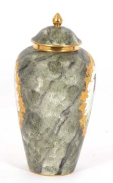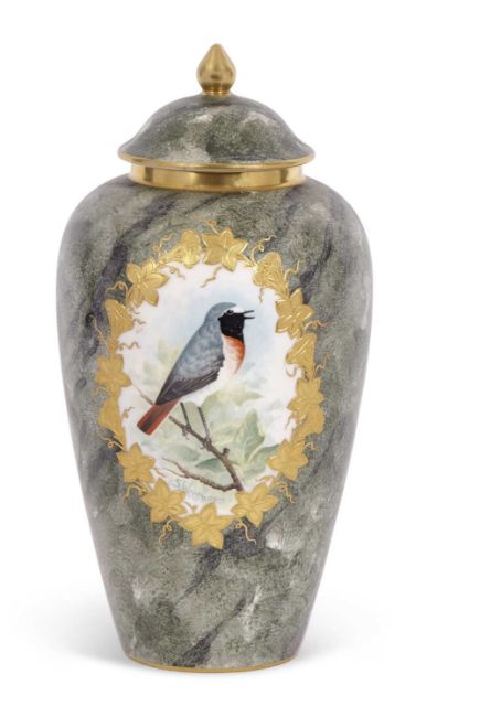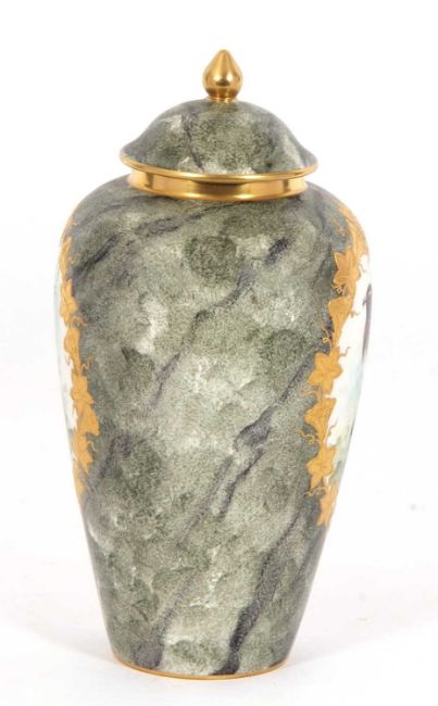 A Coalport vase and cover, painted with birds and a mottled green ground signed S Woodward