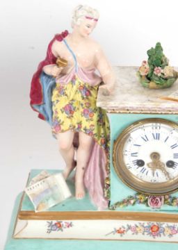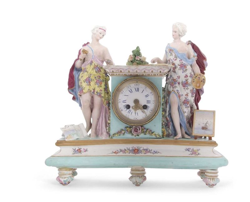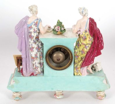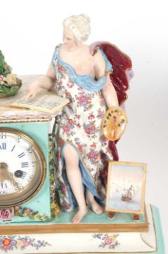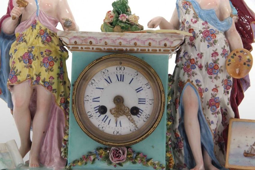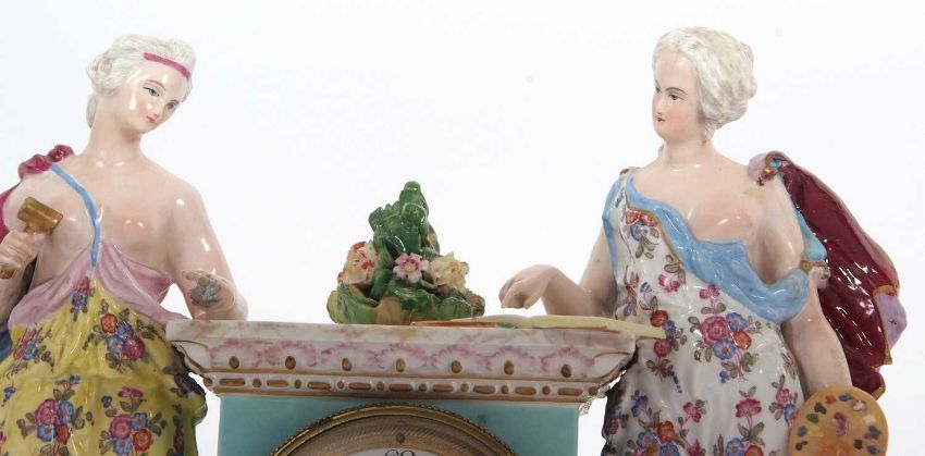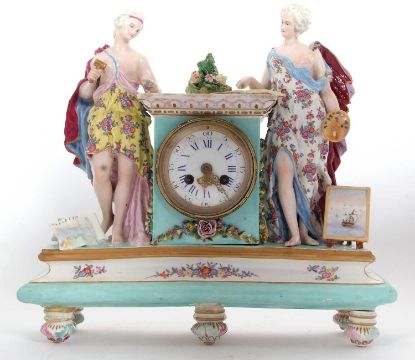 A mid 19th Century continental porcelain cased mantel clock in Meissen style, the plinth raised on feet and surmounted by a central plinth, flanked by classical figures depicting industry and art with polychrome decoration and gilt highlights (some restoration), the clock with cast brass and beaded bezel enclosing a Roman and Arabic enamel dial with outside minute track and pierced and engraved brass hands to a circular brass movement with back mounted count wheel and anchor escapement, striking on a bell, 35cm high