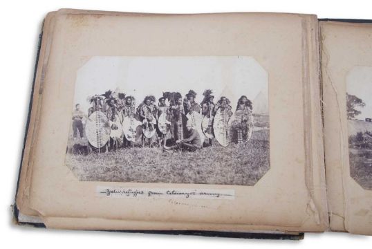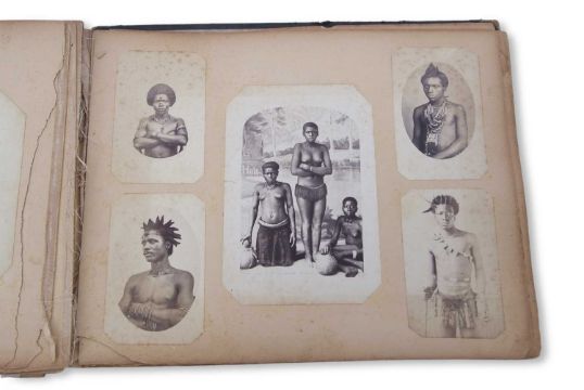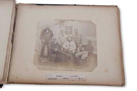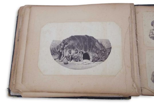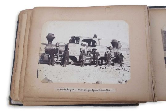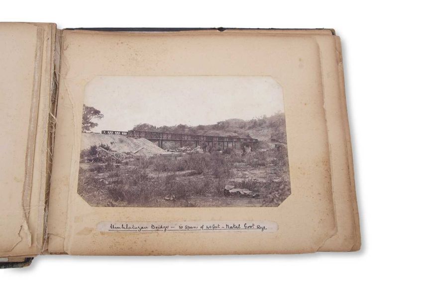 An important Victorian photograph album of historical and topographical interest with photos from the Zulu War of 1879 each photo with handwritten title comprising; photographs of Zulu men and woment including "Cetewayo- King of Zululand", " Zulu refugees from Cetewayo's army, " " Rorkes Drift after the Battle," First Sight of Ulundi - Zulu War," " The Queen's Cross, erected on spot where the Prince Imperial was killed - Zulu Land," Dance in honour of Major Stabb in command of party sent to erect Cross," (NB; The Prince Imperial refers to Louis Napoleon Bonaparte, only son of Napoleon III, who was serving with British forces and killed in a skirmish with a group of Zulus) also included are various photographs of Natal Government Railways structures including; "Lower Umbilo Bridge," "Tunnnel under High Road," Wallacetown - Inchanga," "Bridge No8 Inchanga," "Inchanga Viaduct," No2 Bridge Inchanga," Umklatuzan Bridge," No1 Bridge Inchanga, also view of "The Station and Customs House Cape Town and views of "Adderley and Darling Streets Cape Town. Album also includes views of James Town, St Helena and St Thomas from French Wharf. Other photographs include various views of the Bolan Pass, Baluchistan, Pakistan including "Kirta Dak bungalow- Bolan Pass," "Kundalani Gorge - Bolan Pass," "Machi Railiway Station Bolan Pass," Fairlie Engine - Meter Gauge Upper Bolan Pass," ( NB the Fairlie Engine was built by the Avonside Engine Company, Bristol and a number were used on the Bolan Pass Railway), " Wreck of train - Bolan Pass 1886," "Railway Accident at Machi Dec 1885," "Nundicanama Tunnel" and "Broad Gauge Brake Van being mounted on narrow gauge Bogies - Bolan Pass. Over 70 photographs mainly 15x20cms, album in distressed condition with spine broken and soem pages loose, photos generally good condition with some spotting and staining to mounts. Provenance many taken by a family member serving with the British Army, Royal Engineers and thence by family descent ( see also lot no: 163 ) Album in distressed condition with spine broken and some pages loose, photos good with spotting and staining to mounts