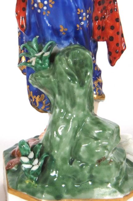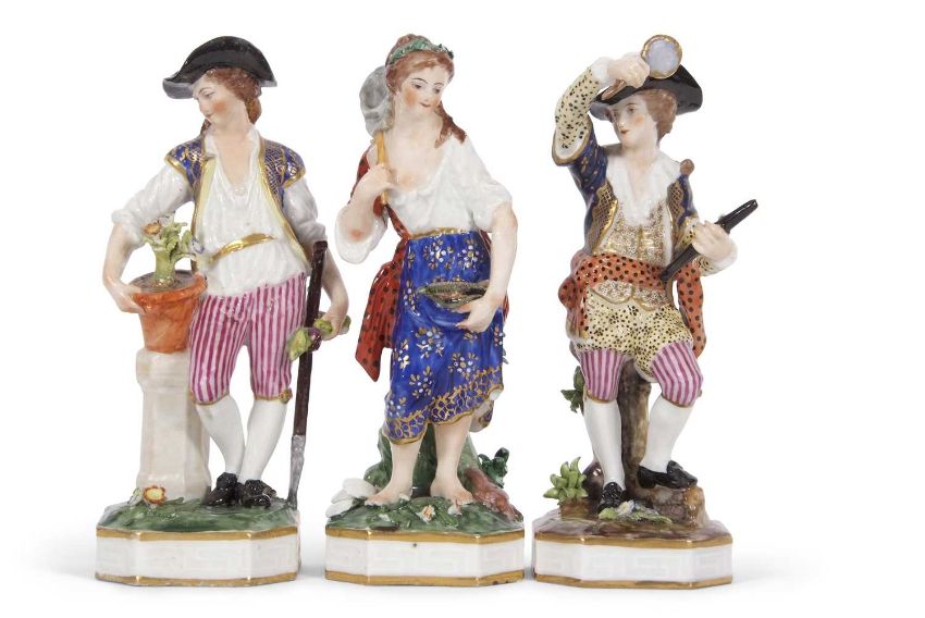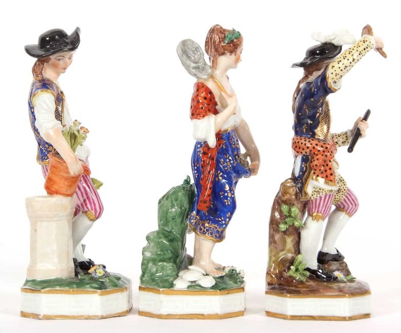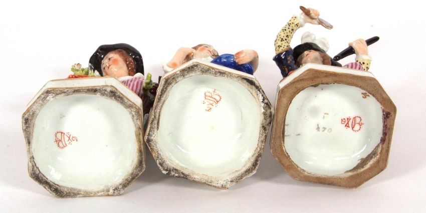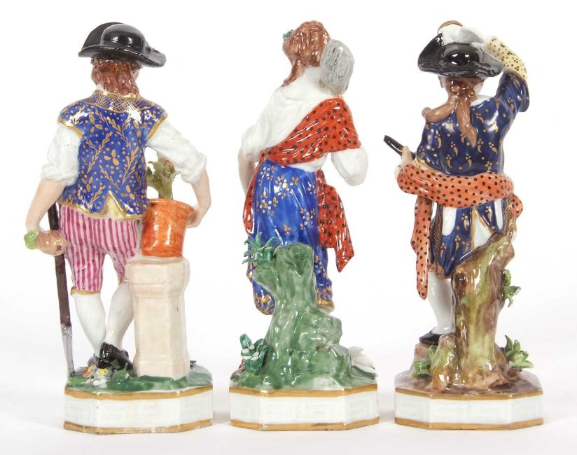 A group of three 19th Century Derby figures including a gardener and a musician and a fish seller, all on shaped bases, factory mark in red to base, largest 17cm high