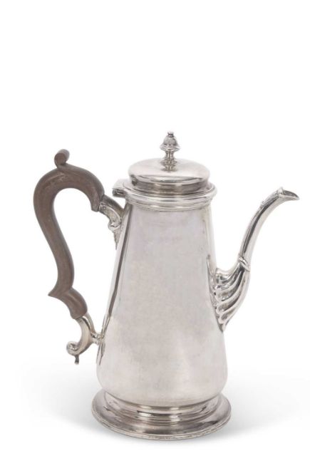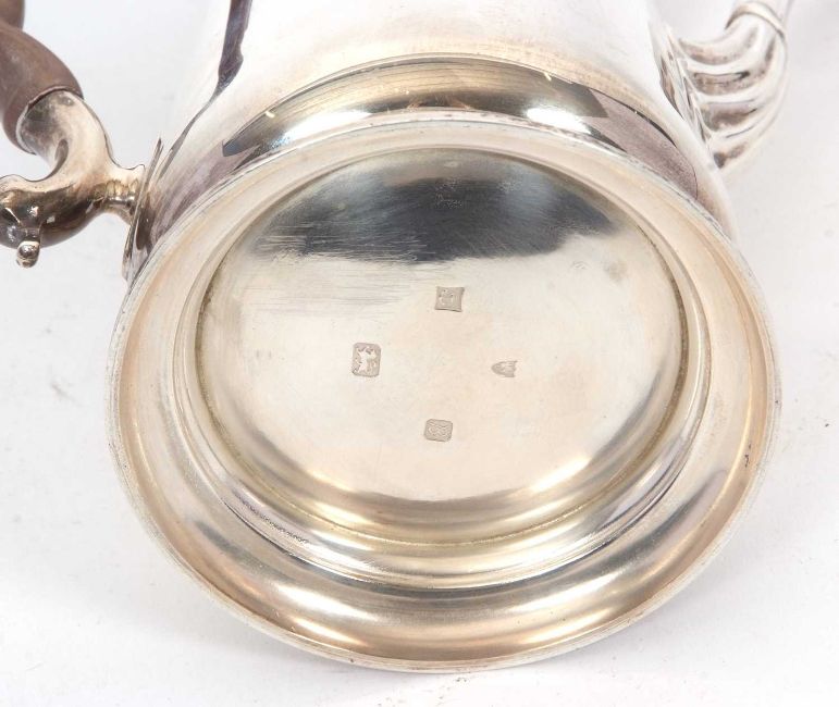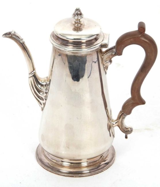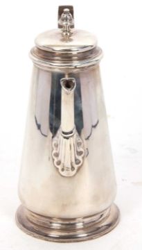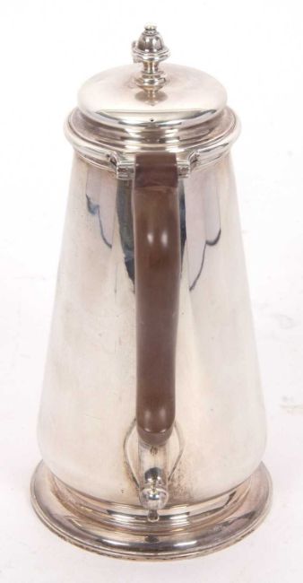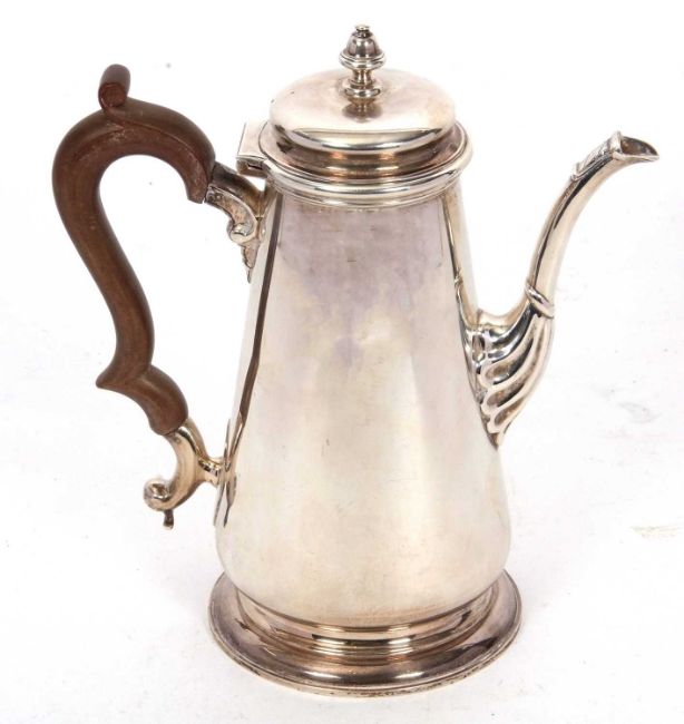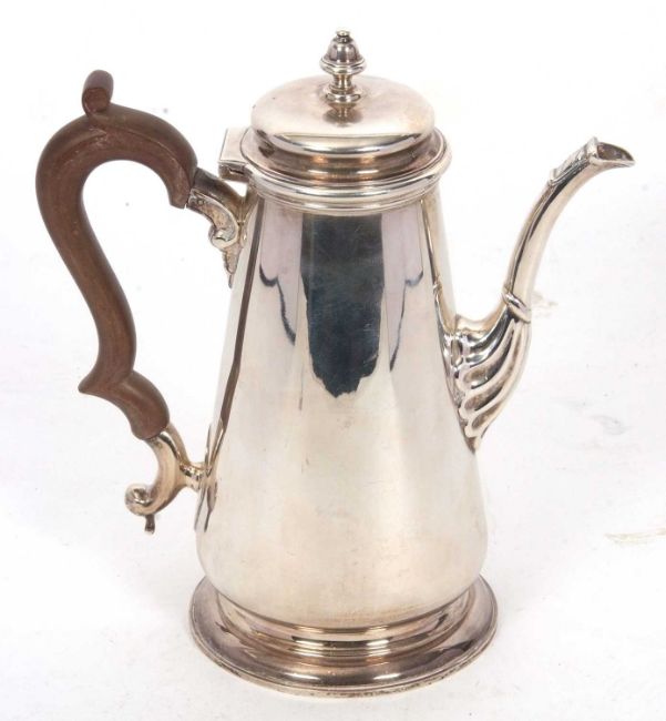 An Elizabeth II silver coffee pot in George I style, of tapering cylindrical form having a slight domed hinged lid with urn finial, supported on a spreading circular foot, 23cm tall, hallmarked for Birmingham 1976, makers mark J B Chatterley & Sons Ltd, gross weight 852 grms.