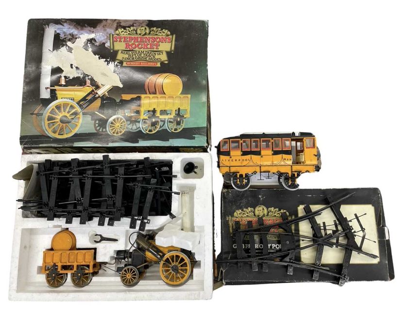 A boxed Hornby G100 3 1/2'' gauge Stephensons Rocket real steam train set, together with G103 Pair of Y points and a G104 Liverpool-Mancheter Railway Company coach.