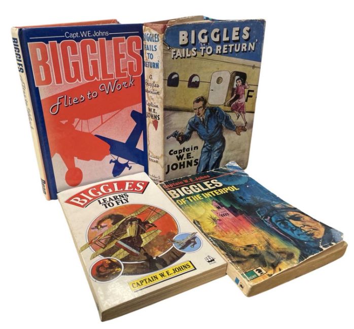 W E JOHNS: BIGGLES, various titles: BIGGLES FLIES TO WORK, London, Deans International , 1985; BIGGLES FAILS TO RETURN, London, Hodder and Stoughton, 1951, Fourth impression, original unclipped dustjacket; BIGGLES OF THE INTERPOL. Leicester, Knight Books 1968, Third impression; BIGGLES LEARNS TO FLY, London, Armada, 1963 (4)