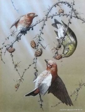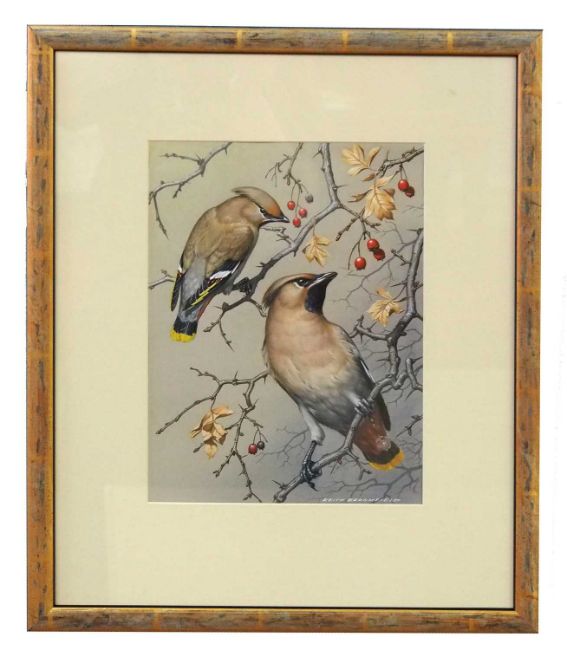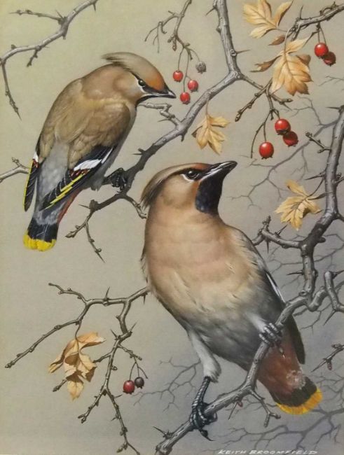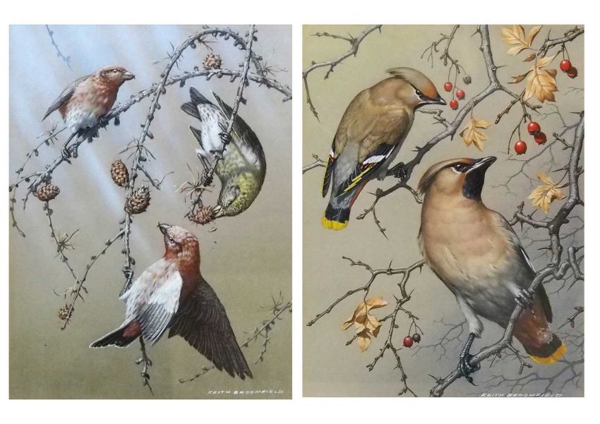 Keith Broomfield, studies of 'Crossbills' and 'Waxwings', gouache, signed and inscribed verso, 29x21cm, framed and glazed (2)