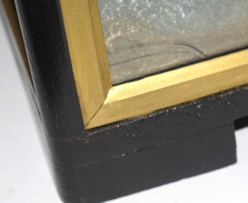 Early to Mid 20th Century Taxidermy cased Common Buzard (Buteo buteo) by Hutchins of Aberystwyth. Set in naturalistic setting sat on rocks with grasses and foliage and painted sunset background. Set in three glass panelled, black ebonised case with gilt border, with four pegs to top of case, sloping edges, pillars and four flush feet to base. Case dimensions: 58.5cm x 25.5cm x 61.5cm